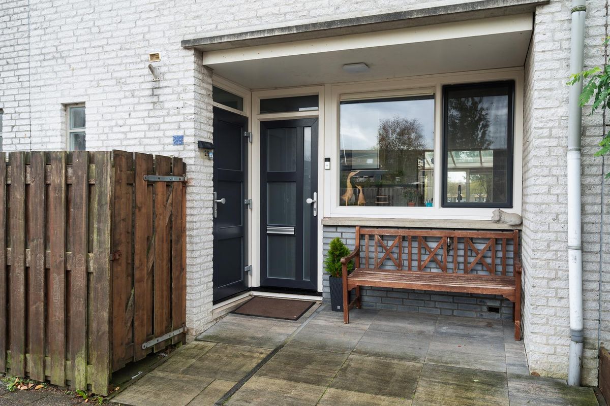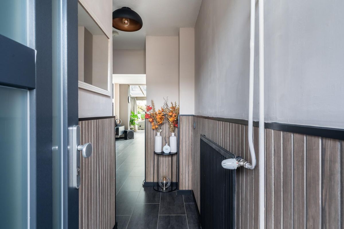Voortuin met houten fietsenberging en stenen berging die ook van binnenuit bereikbaar is. Entree, hal met meterkast (vernieuwd in 2024), moderne toiletruimte (hangend met fonteintje), trapopgang naar boven en entree naar de woonkamer.
