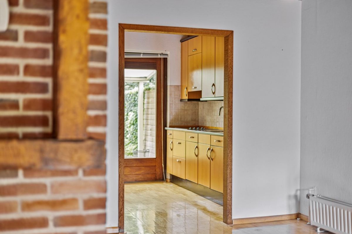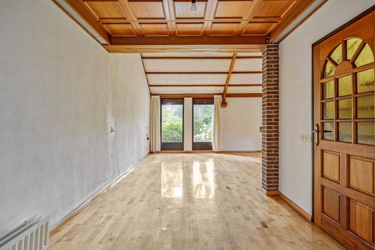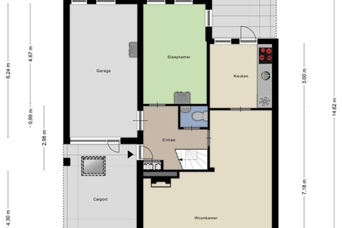 U komt via de oprit met carport bij de voordeur aan de zijkant van de woning binnen in een ruime hal met aan de linkerzijde een deur naar de garage en een deur naar de slaapkamer op de begane grond. Verder treffen we in de hal de trap naar de verdieping, het toilet en tegenover de voordeur is de deur naar de woonkamer met halfopen keuken.