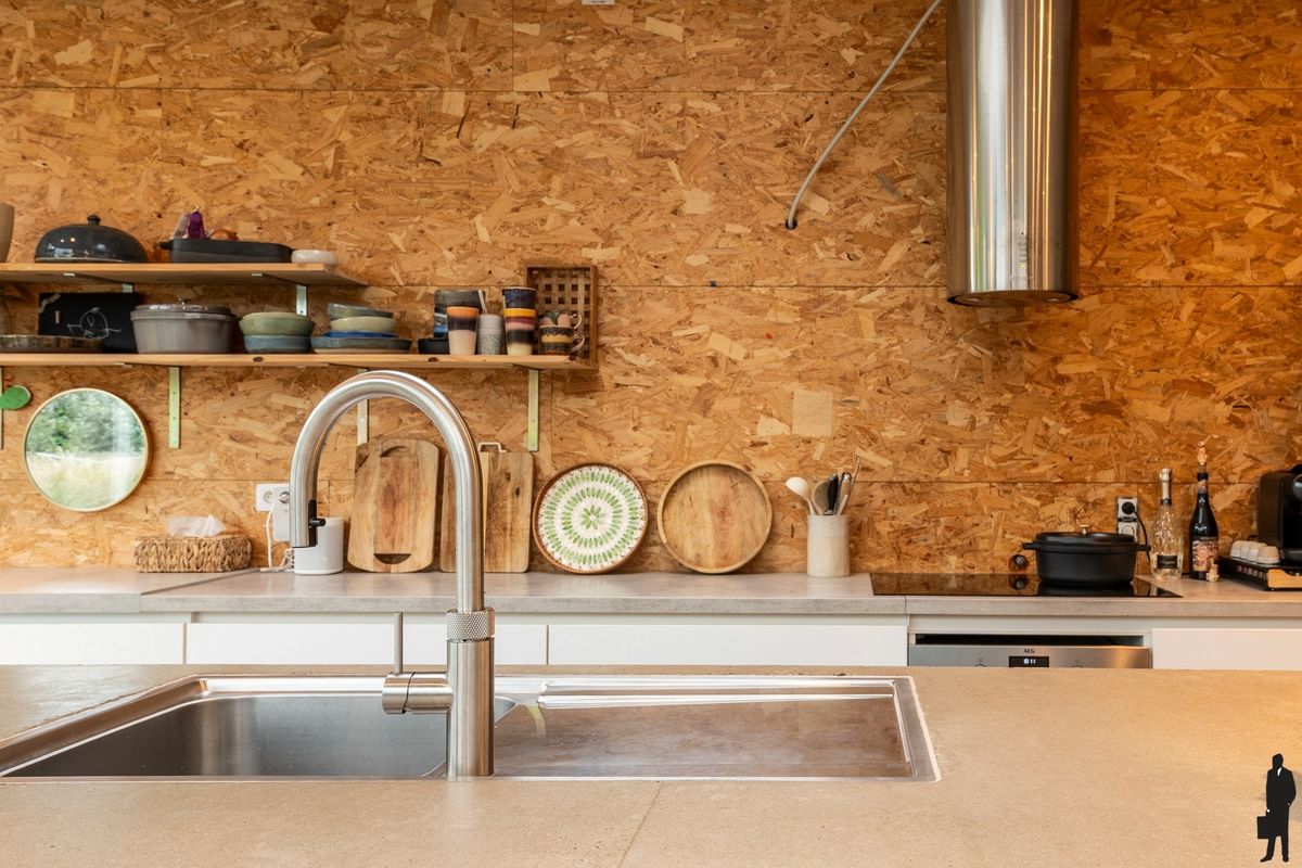 Deze leefruimte geniet van veel natuurlijk daglicht door de riante raampartijen die uitgeven op de diepe natuurtuin met verhoogd infinity-zwembad en vijverpartij. De keuken - met aansluitend ontbijtgedeelte - op hoogte is uitgerust met alle nodige kwaliteitstoestellen: inductievuur, heteluchtoven, Quooker, vaatwas, etc. (AEG, Faber, e.a.).