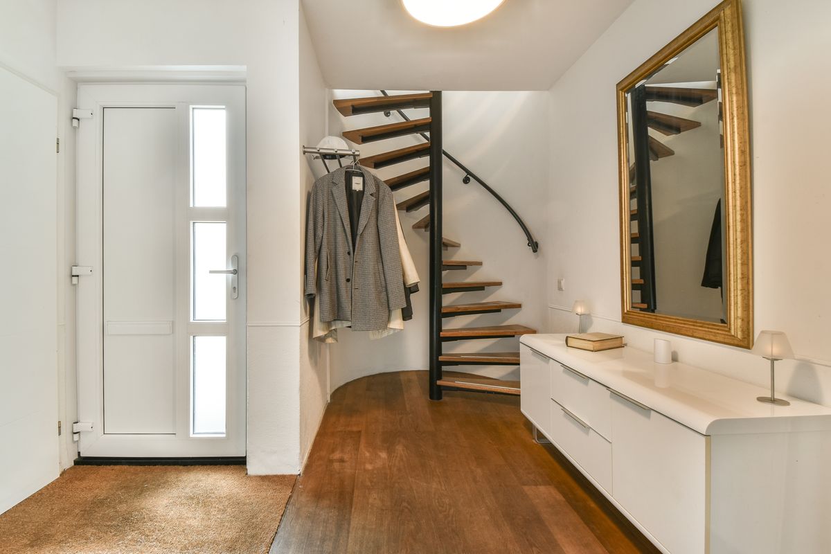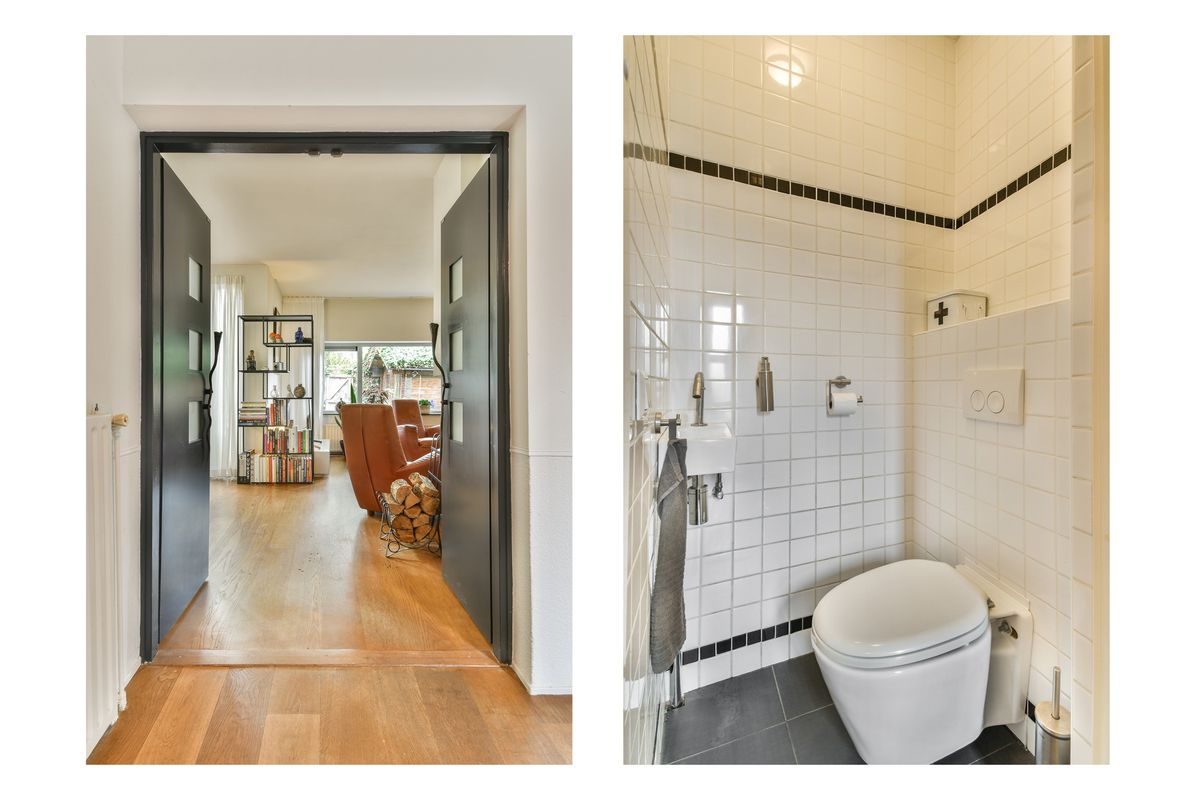 De entree is uitnodigend en praktisch ingedeeld. In de hal bevinden zich de meterkast (met 8 groepen en 2 aardlekschakelaars) en een modern hangend toilet met fontein. Via deze ontvangsthal bereikt u ook de berging. Via de hal bereik je de sfeervolle woonkamer, waar de Frans eikenhouten vloer en de open haard direct een warme sfeer creëren. Grote ramen en openslaande deuren zorgen voor een mooie verbinding met buiten. Vanuit de woonkamer stap je zo de fraai aangelegde achtertuin in, die op het oosten ligt en daarmee de zon vangt van de vroege ochtend tot in de middag. Achterin de tuin bevindt zich een houten berging met elektra en een handige achterom.