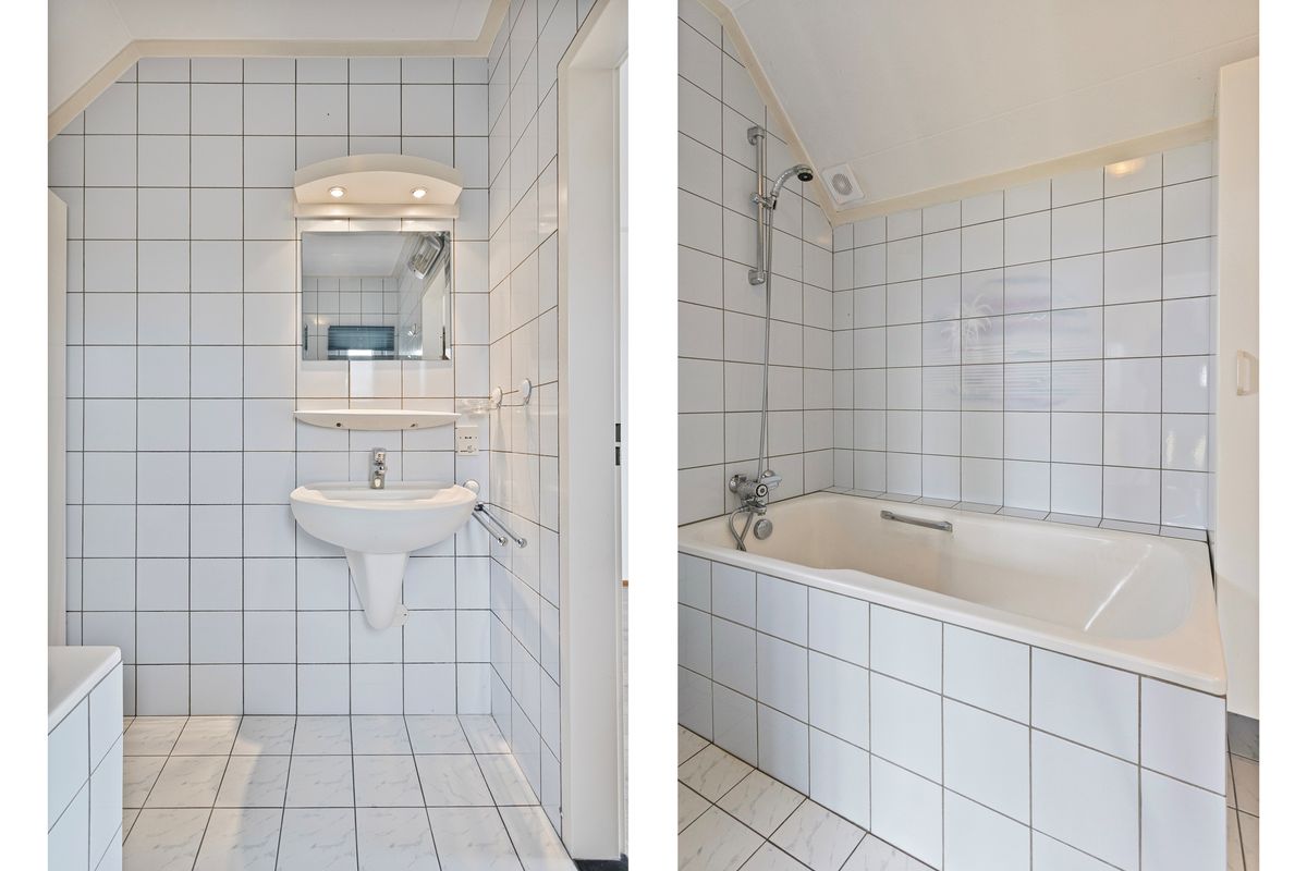 Vanuit de bijkeuken is er toegang tot de badkamer, welke geheel is betegeld. Het is een praktische badkamer met een inloopdouche en wastafel.