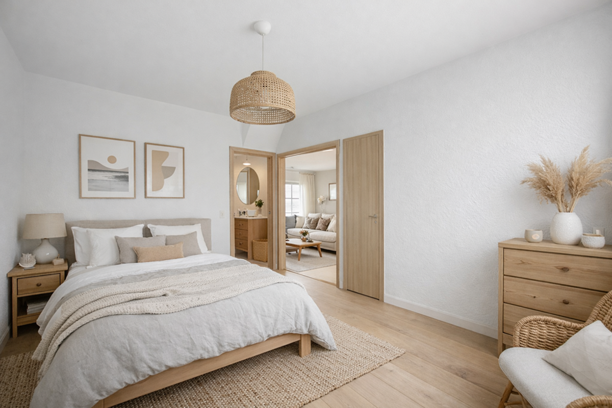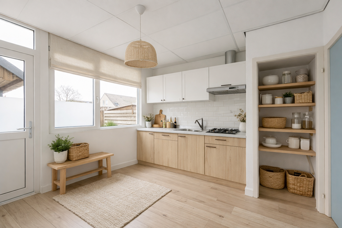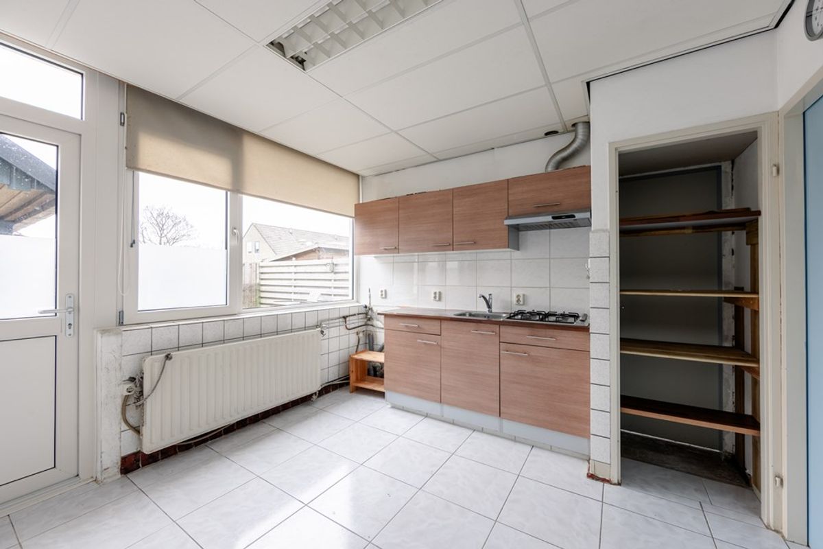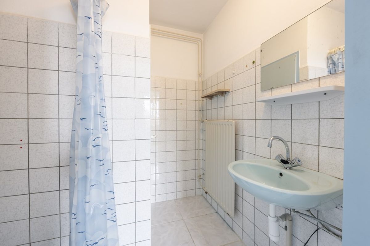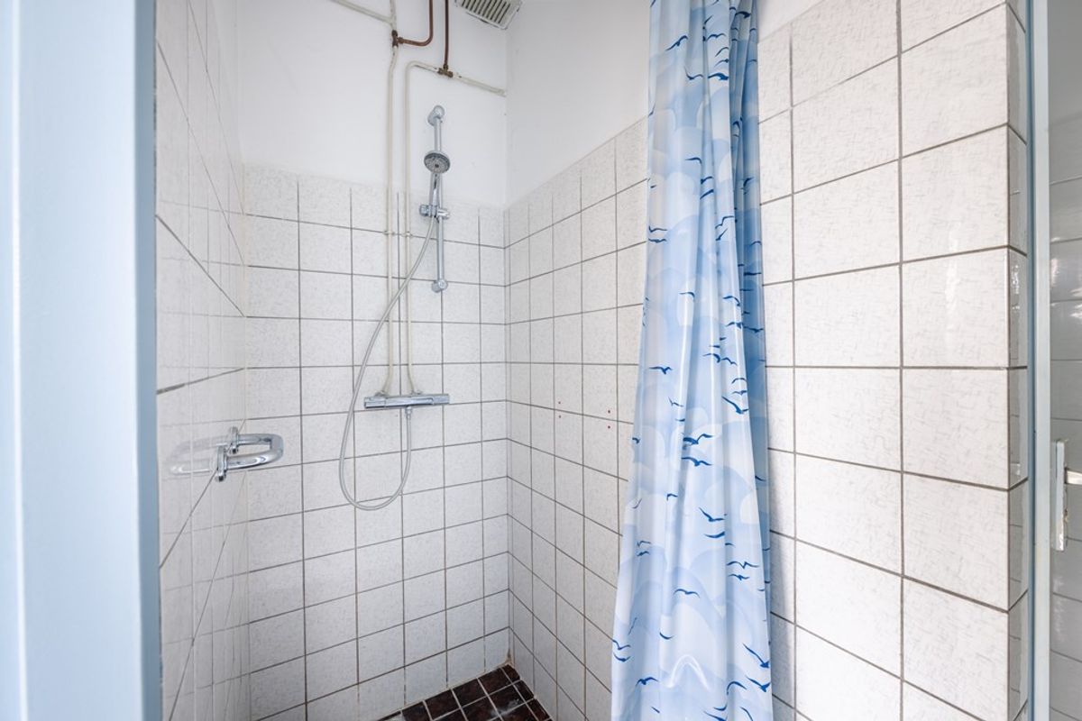 De dichte woonkeuken heeft een airco die ook kan verwarmen. Je kunt er ook een halfopen keuken van maken. De slaapkamer op de begane grond heeft een diepe opbergkast en een deur naar de badkamer met een inloopdouche, wastafel en een doorloop naar het toilet.