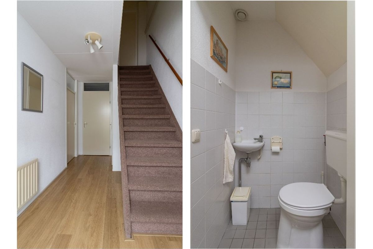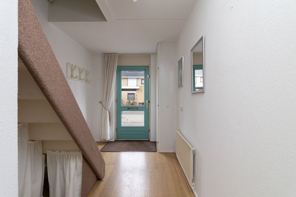 Via de entree/hal met meterkast en trapopgang bereikt u het separate toilet en de badkamer. Vanuit de hal is er toegang tot de ruime en lichte woonkamer, die in open verbinding staat met de keuken. De keuken is praktisch ingericht en biedt toegang tot de berging. Aansluitend bevindt zich de slaapkamer, gelegen aan de achterzijde van de woning.