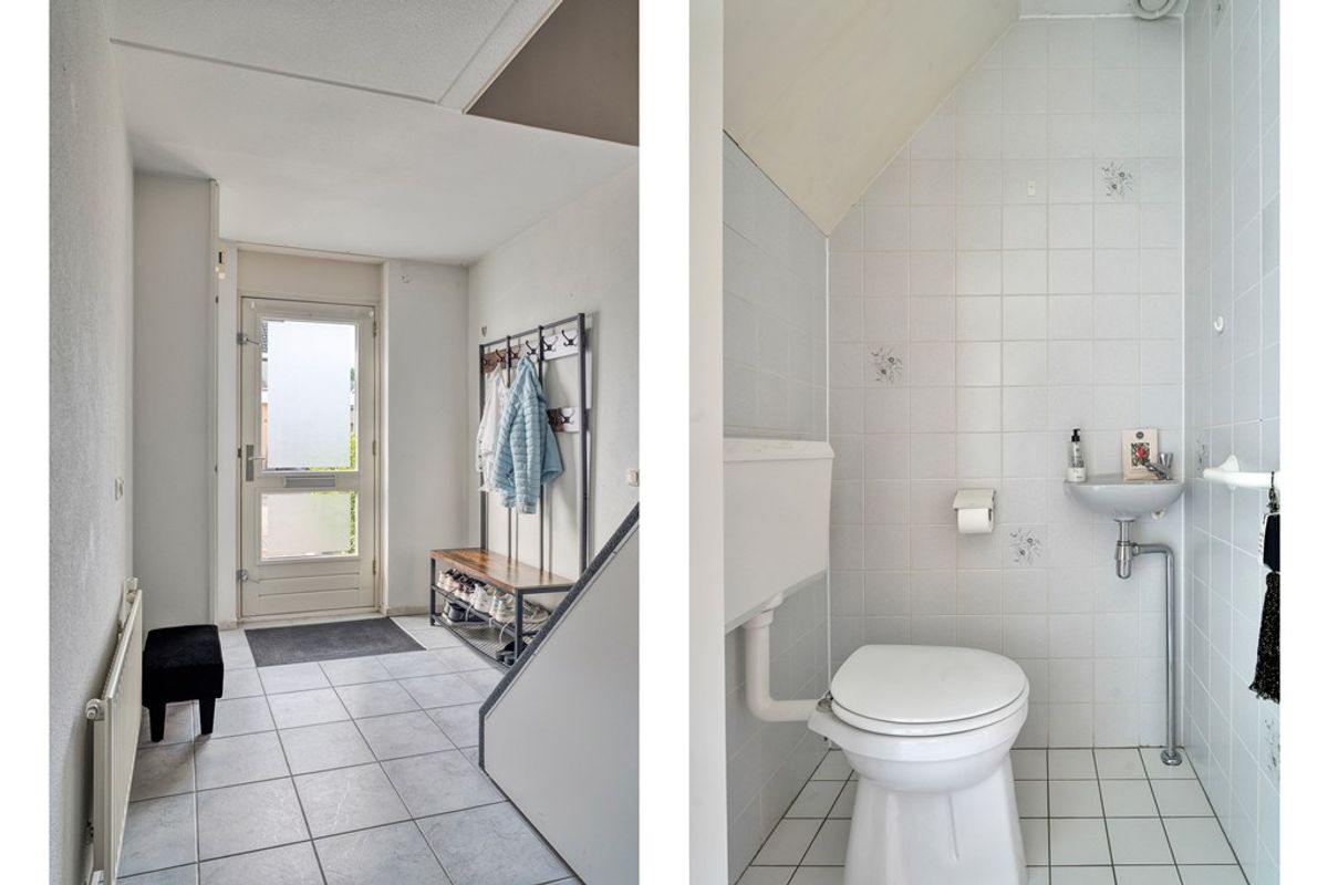 Via de entree bereikt u de hal met toilet, bergkast en trapopgang. De lichte woonkamer vormt het hart van de woning en staat in verbinding met de keuken. Aansluitend bevindt zich een praktische bijkeuken, ideaal voor extra opslag of het plaatsen van witgoed.