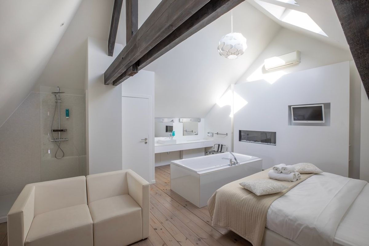 On the second floor, there are four modern rooms, with the possibility of connecting the two 15 m² rooms, a luxurious 25 m² room, and a 35 m² suite.