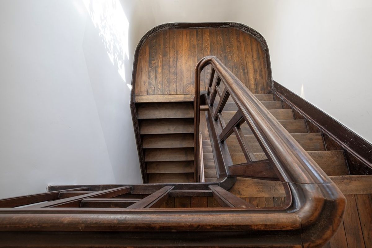 Via de oorspronkelijke houten trap bereiken we de eerste verdieping (+1) waar het karakter van het pand harmonieus wordt verdergezet