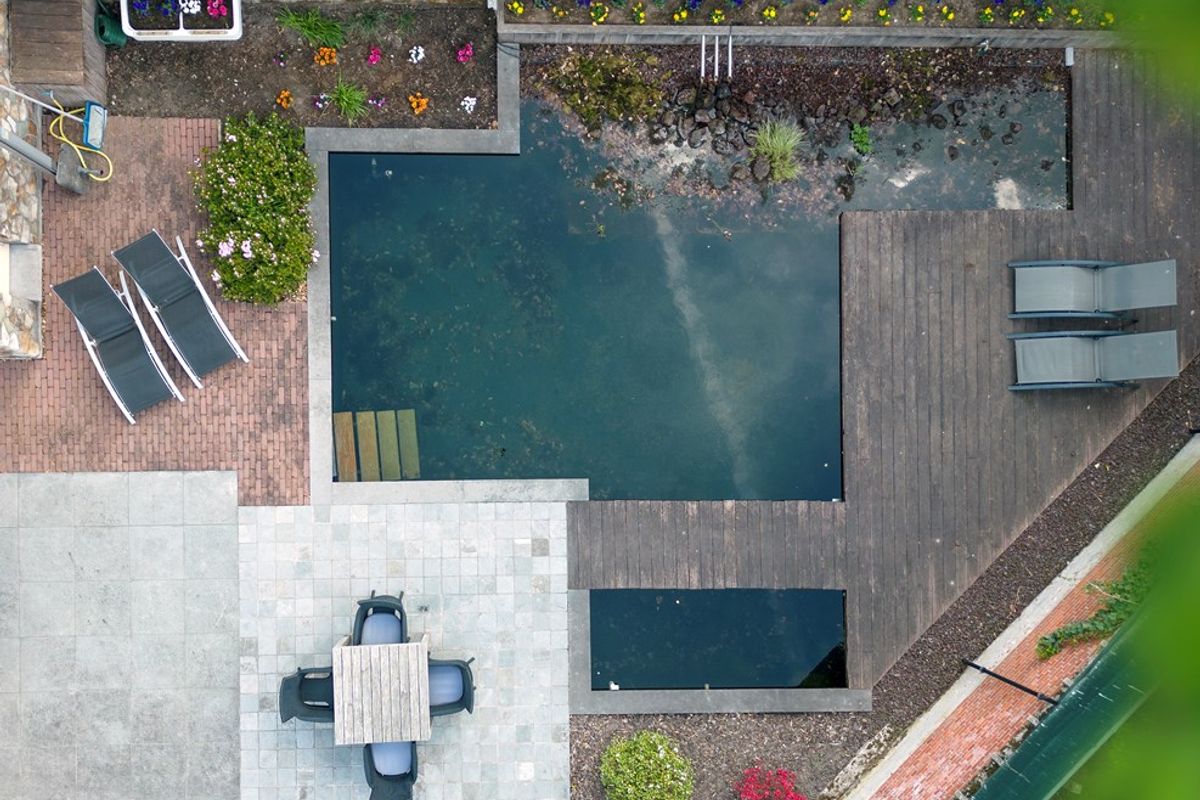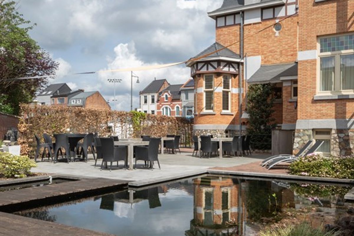 Achter de elegante gevel ontvouwt zich een verrassend rustige buitenruimte: een zonnig zomerterras en een open zwemvijver creëren een groene, serene oase die zeldzaam is in een stedelijke context. Hier geniet men in alle privacy van rust, comfort en verfijning, midden in het bruisende hart van de stad.
