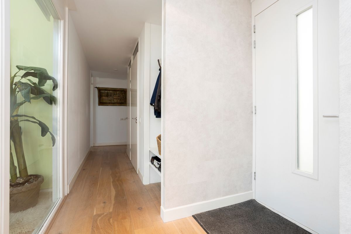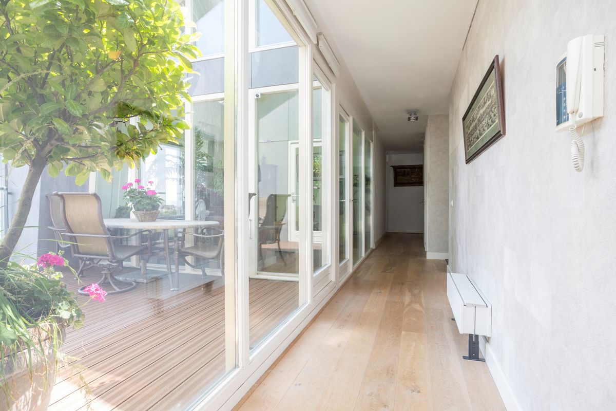 Terug naar de entree komen we de eerste slaapkamer tegen, deze is nu in gebruik als tuinkamer, een prachtige kamer met hoog plafond met veel lichtinval. Verder is er nog een 2e slaapkamer met een vaste kastenwand en een walkin-closet, wat een luxe. Vanuit de deze slaapkamer ook toegang tot de luxe badkamer met een design ligbad, royale inloopdouche, dubbele wastafel en een prachtige spiegel met verwarming. Ook fijn dat er vloerverwarming aanwezig is. Tot slot is er naast het toilet met fonteintje een heel fijn dakterras, heerlijk genieten van de zon en prachtig zicht op de omgeving.