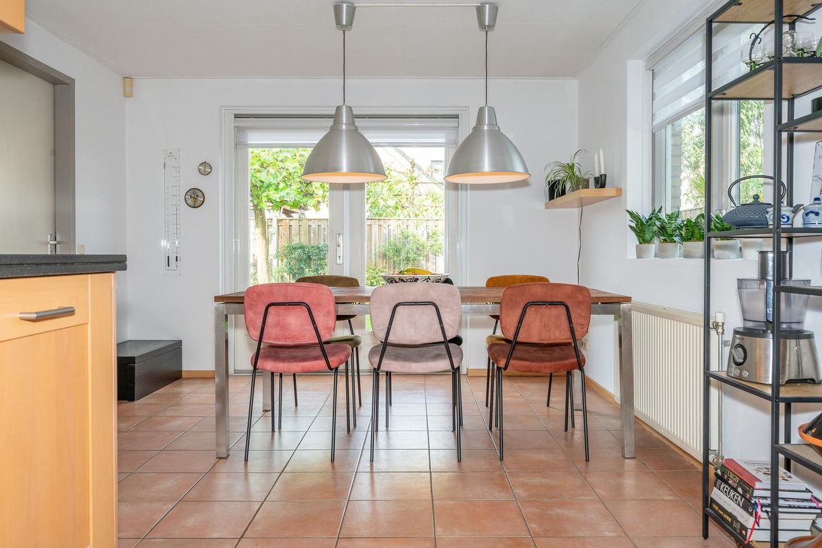 De entree aan de zijkant van het huis geeft toegang tot een ruime hal met het toilet en de toegang tot de U vormige kamer. Het woongedeelte aan de voorzijde is heel licht en ruim, evenals het gedeelte tussen de voor- en achterzijde van de woning waar plek genoeg is voor bijvoorbeeld een extra kast en een kinderspeelplek. Om de hoek bevindt zich de hoekkeuken met inbouwapparatuur en veel kast- en werkruimte. In de gezellige woonkeuken kan je heerlijk aan de eettafel zitten, met de openslaande deuren naar de tuin. Vanuit hier heb je toegang tot de bijkeuken, die is voorzien van een kastenwand met de wasmachineaansluiting. Ook heb je vanuit hier toegang tot de tuin en de ruime garage. De garage is aan de voorzijde voorzien van openslaande deuren.
