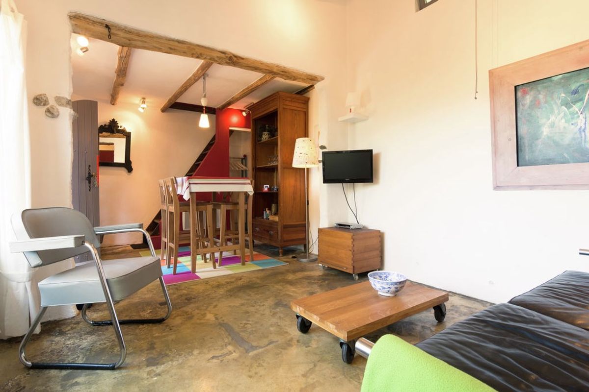 Het eerste vrijstaande bijgebouw (met duiventoren waarin de tweede slaapkamer zich bevindt) van ongeveer 60 m² bestaat uit een open keuken (incl. RVS apparatuur), een woonkamer van 20 m² en een eetkamer met trap naar de tweede slaapkamer en een badkamer met Italiaanse inloopdouche, 2 wastafels en wc.