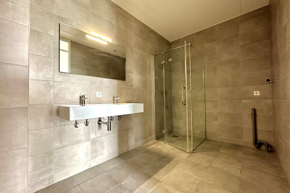 Vanuit hier is er toegang tot de volledig betegelde badkamer met een dubbele wastafel en inloopdouche.