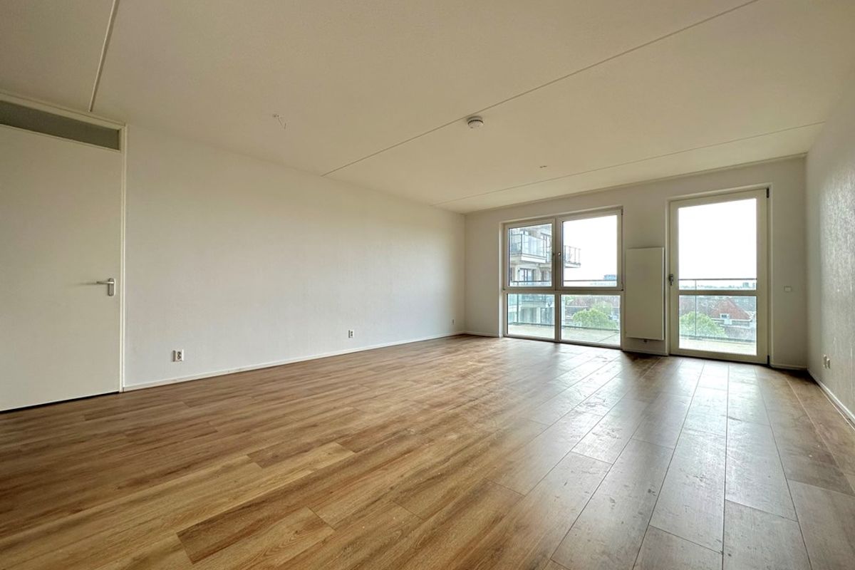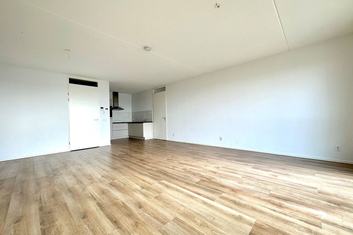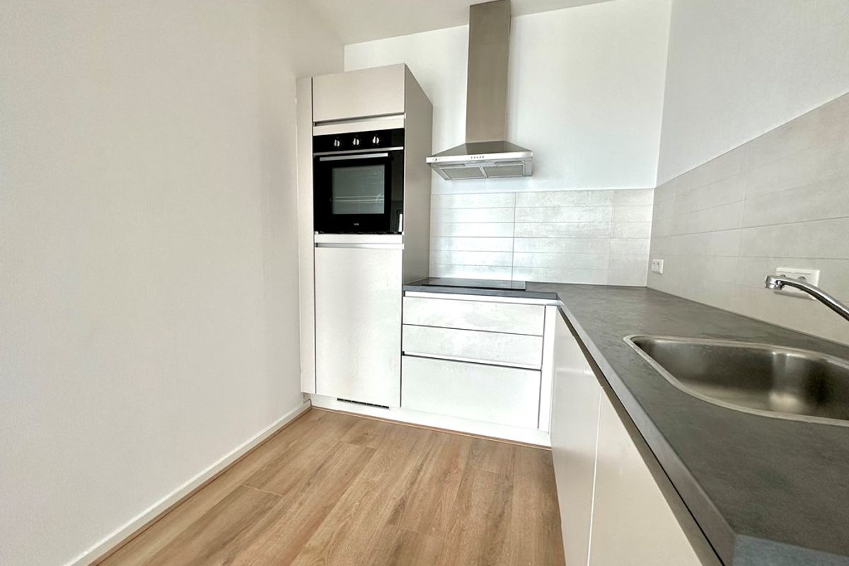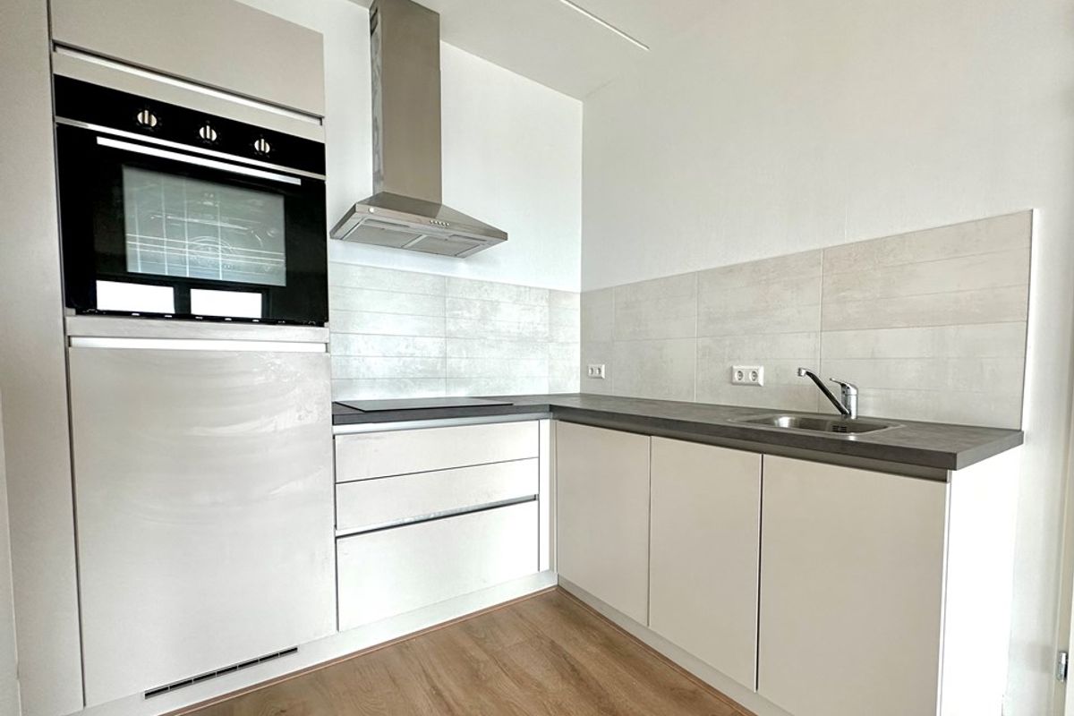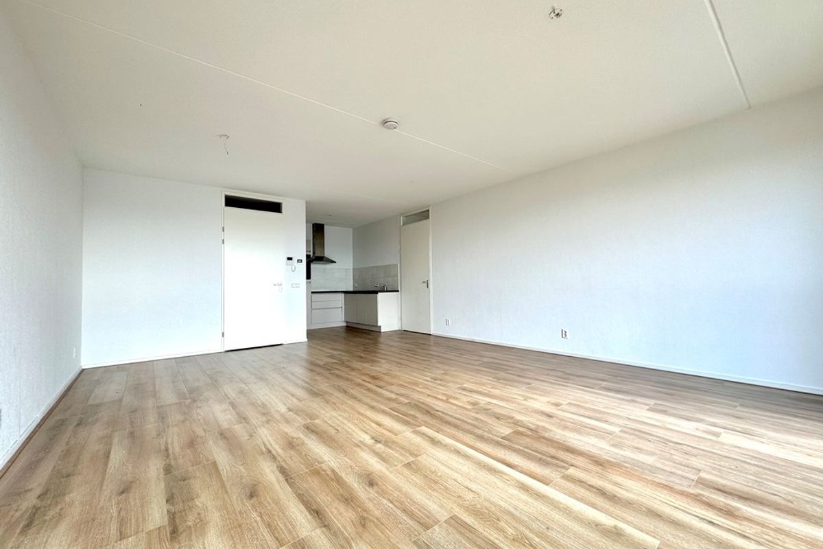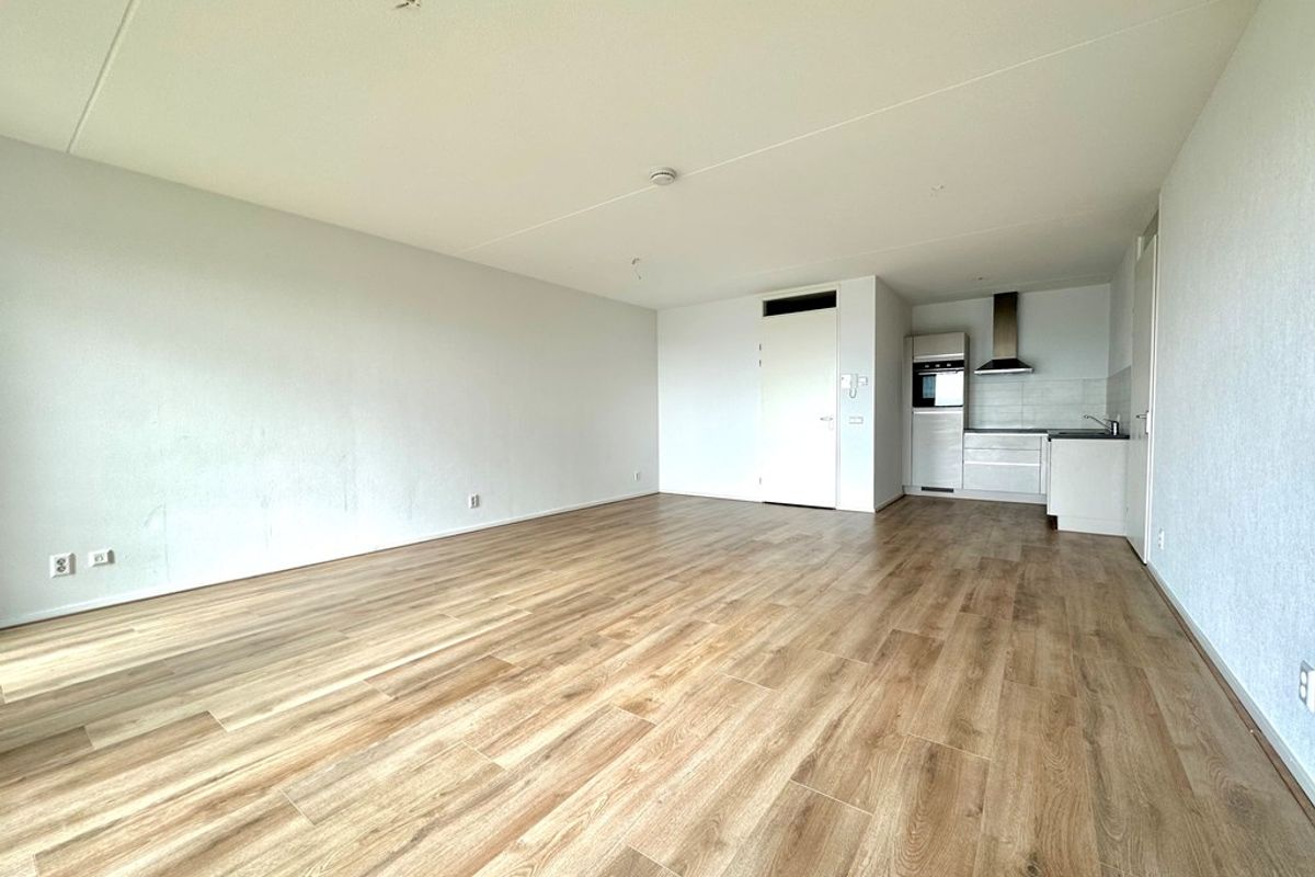 Lichte woonkamer met open keuken, voorzien van een inductiekookplaat, koelkast met vriesvak. Aangrenzend bevindt zich een ruim balkon.