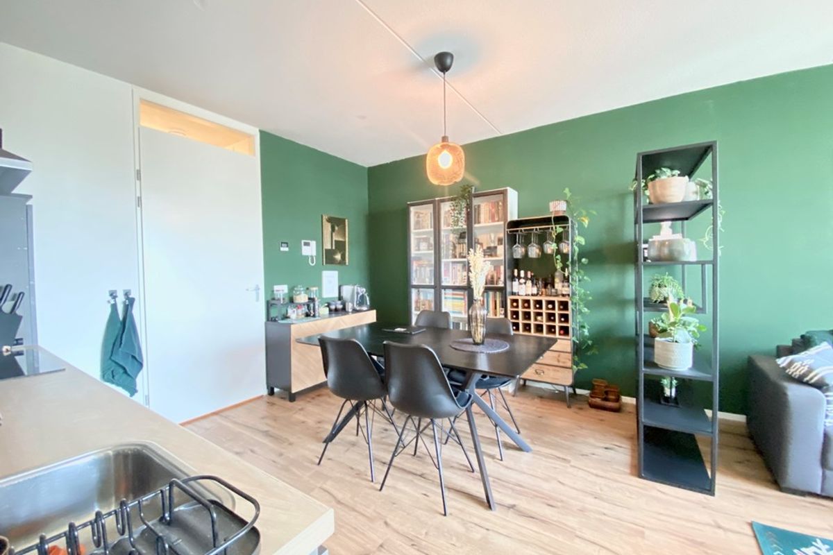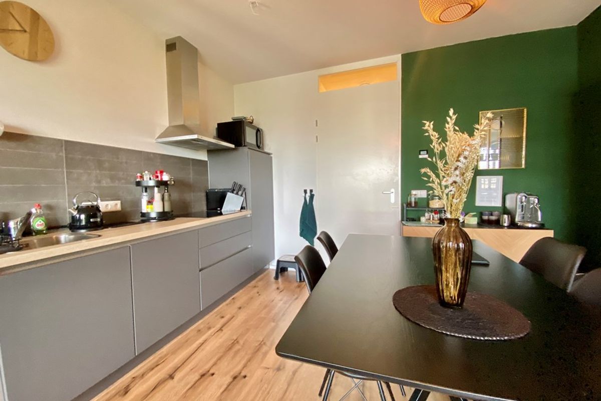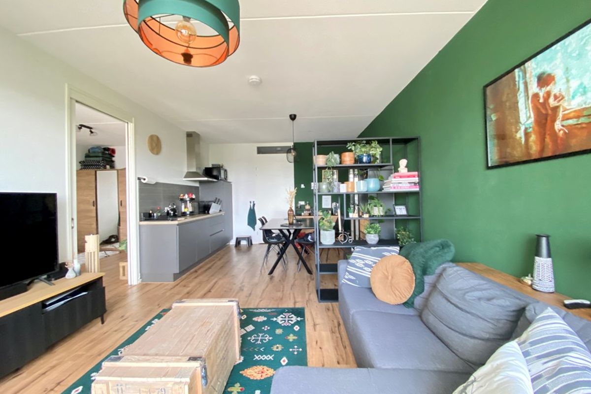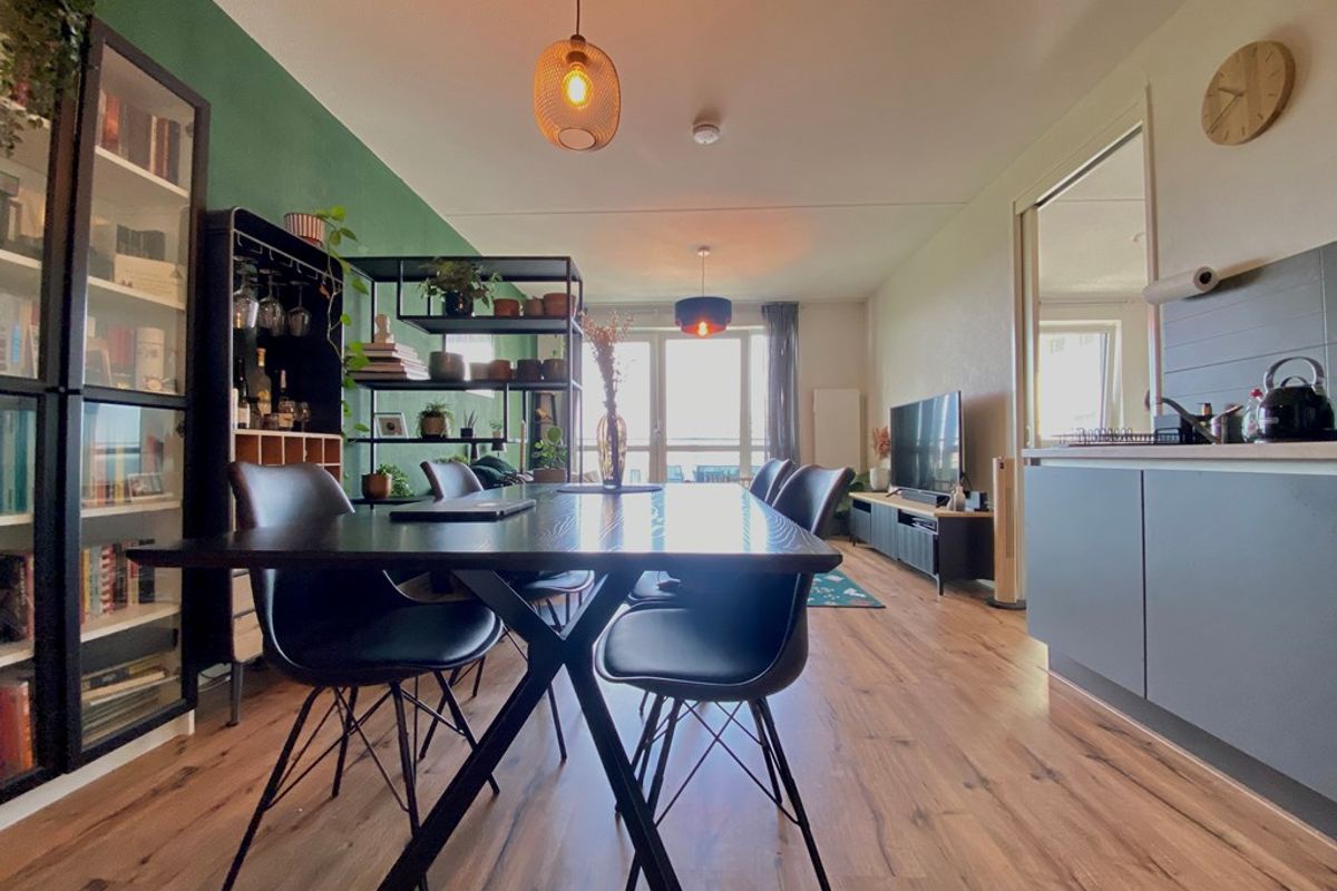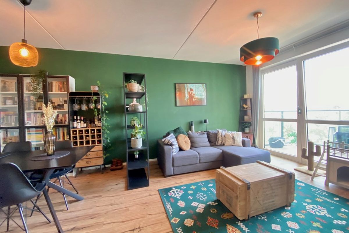 De lichte woonkamer met open keuken geeft toegang tot het ruime balkon.