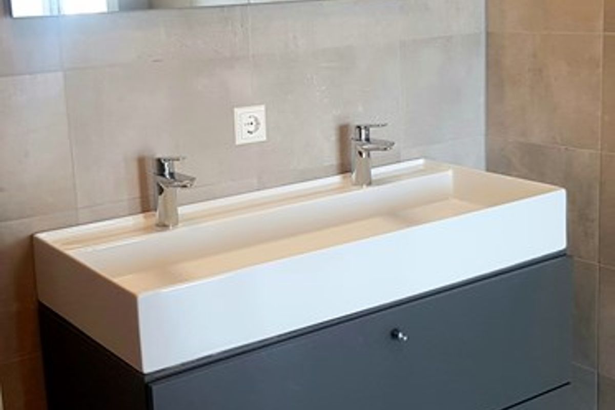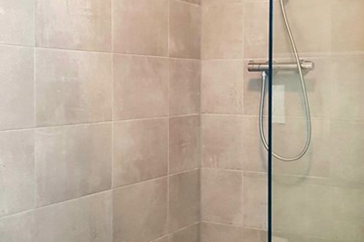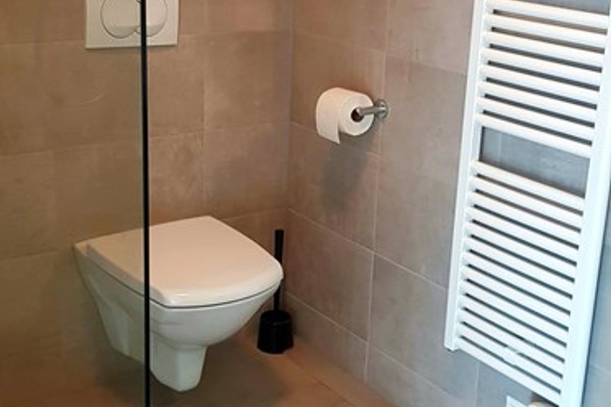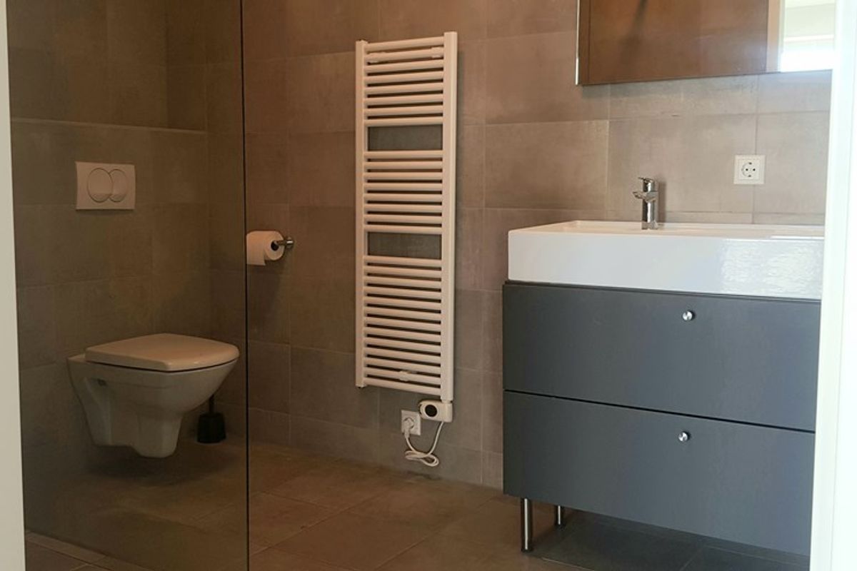 De volledig betegelde badkamer is voorzien van een inloopdouche, een toilet en een dubbele wastafel met spiegel.