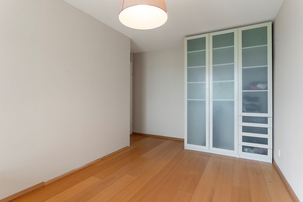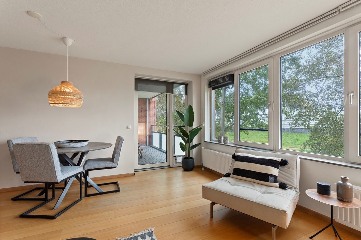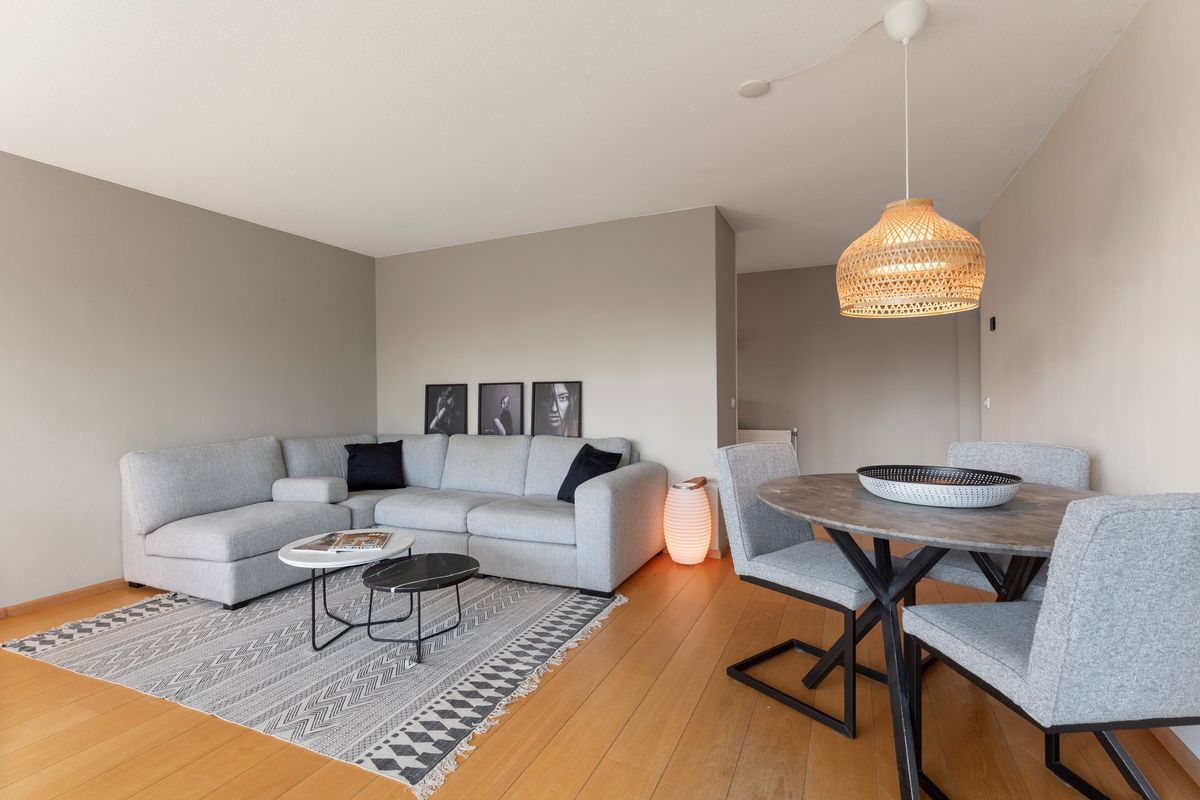 Lichte en verzorgde woonkamer met houten vloer en raampartijen, die voor veel daglicht zorgen. Het balkon is bereikbaar vanuit de woonkamer en de slaapkamer en is gelegen op het zuidoosten met uitzicht op brede groenstrook.