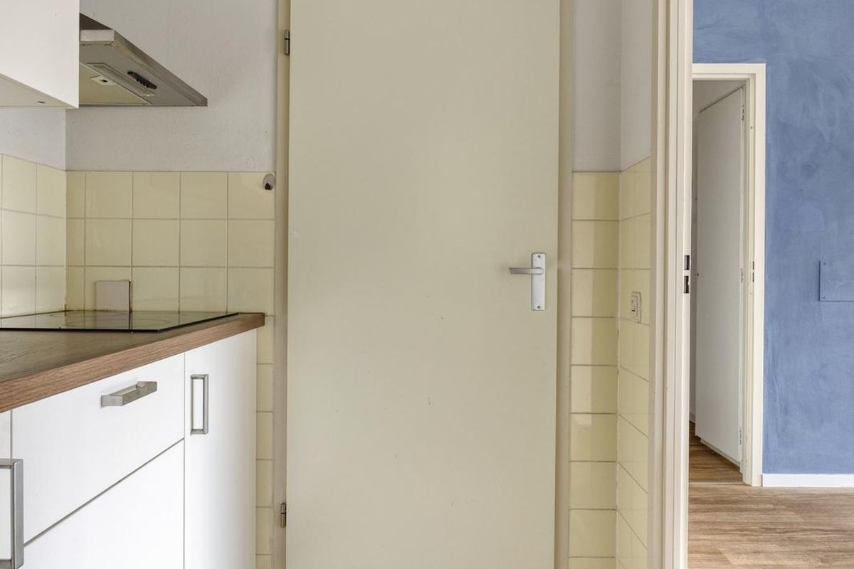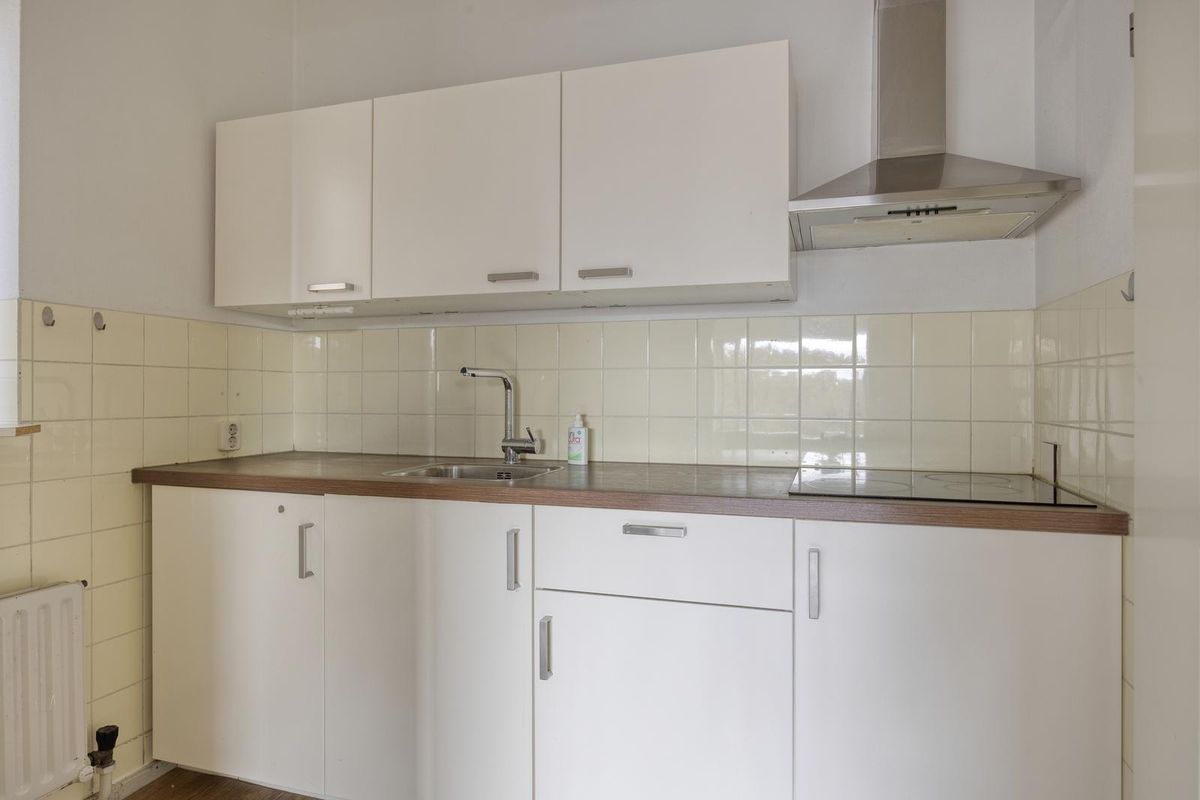 De woonkamer is ruim en licht, met voldoende plek voor zowel een gezellige zithoek als een eettafel. De nette keuken is voorzien van een elektrische kookplaat, afzuigkap en een koelkast met vriesvak. Vanuit de keuken is er toegang tot de bijkeuken, waar de aansluiting voor de wasmachine en droger zich bevindt.