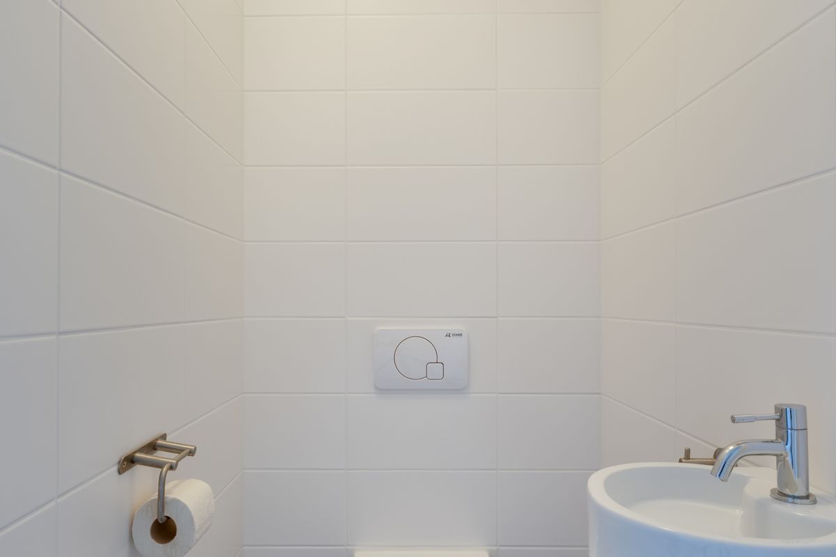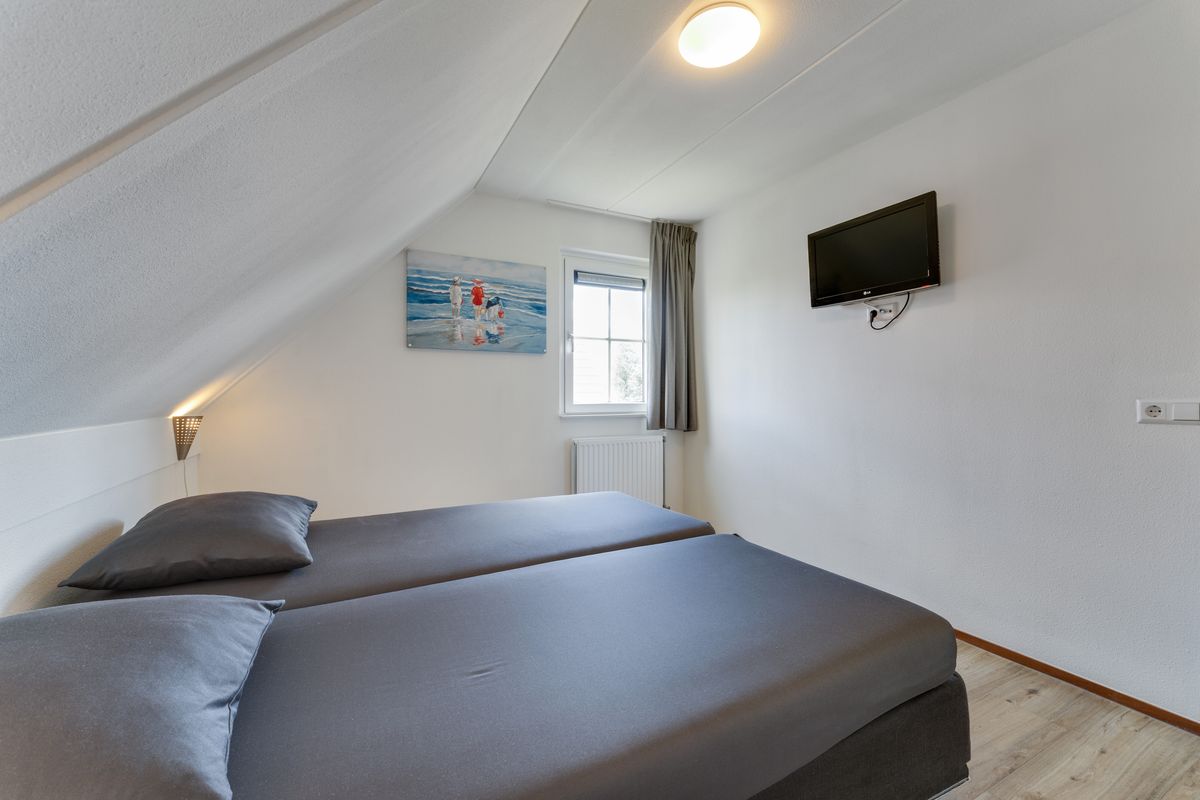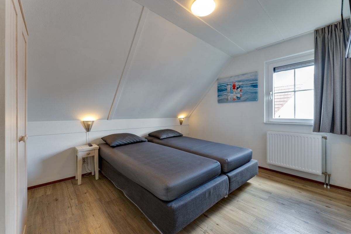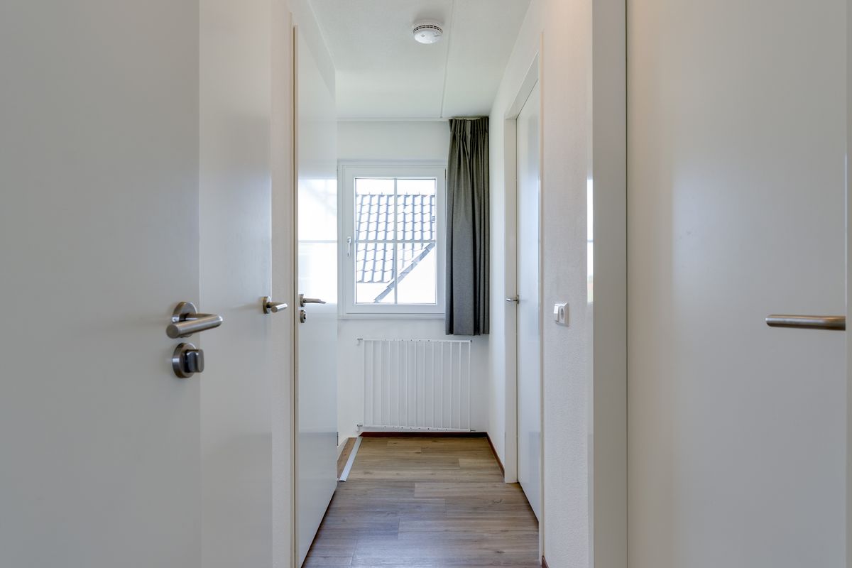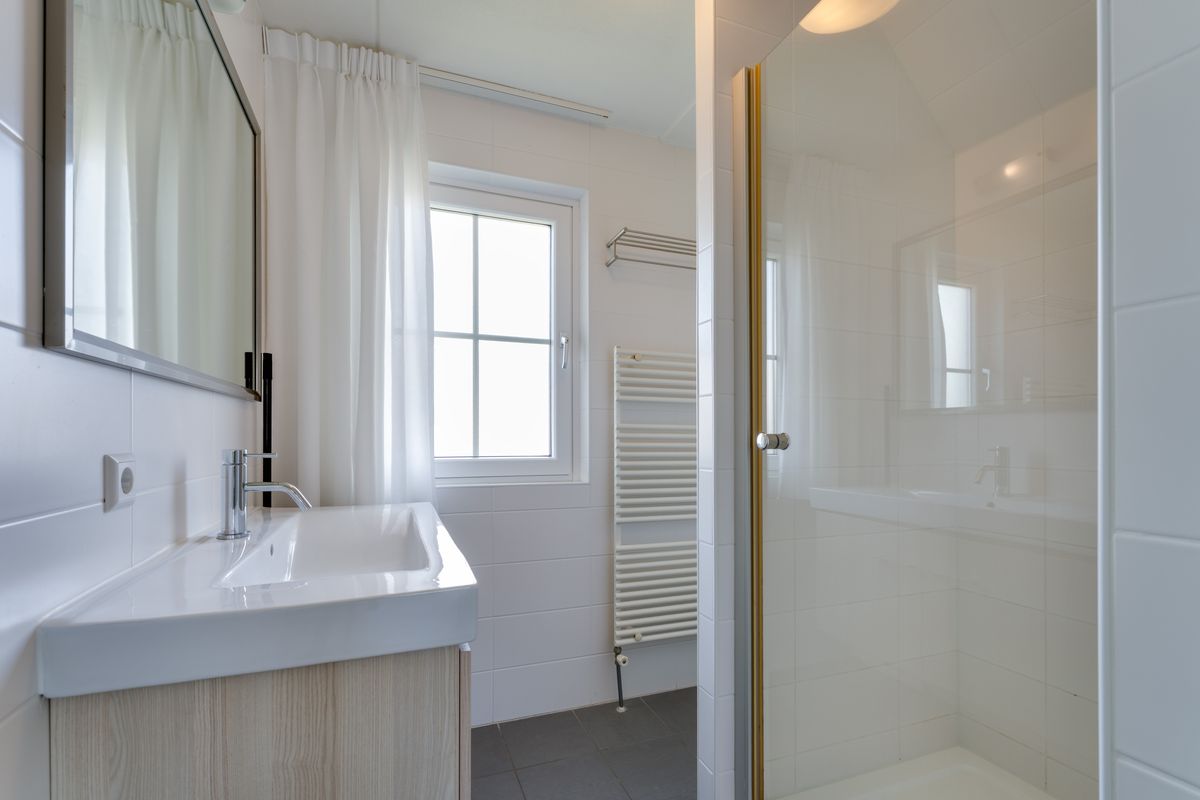 Op de eerste verdieping leidt de overloop naar drie slaapkamers en de badkamer. De hoofdslaapkamer is royaal en biedt plaats aan een tweepersoonsbed met nachtkastjes en kastruimte. De tweede slaapkamer is ingericht met twee losse bedden, de derde kamer met een eenpersoonsbed en bureau. De badkamer is compleet uitgevoerd met ligbad, aparte douche, wastafel en radiator. Op de overloop bevindt zich een tweede toilet, wat extra comfort biedt. Praktisch detail is de afsluitbare eigenarenkast, waar persoonlijke spullen veilig kunnen worden opgeborgen tijdens verhuur.
