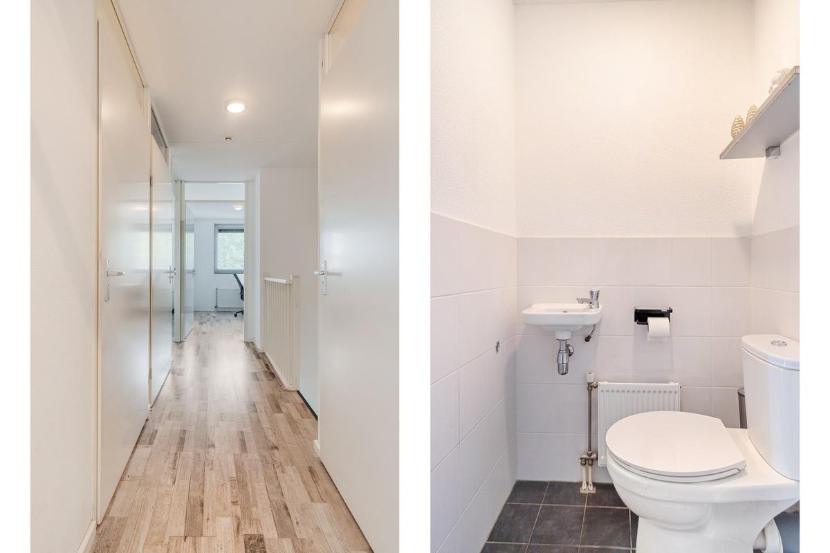 Op de tweede verdieping zijn drie slaapkamers aanwezig. Twee ruime kamers, perfect als master bedroom en kinderkamer, en een kleinere kamer die ideaal is als werk- of hobbyruimte. De moderne badkamer is uitgerust met een dubbele wastafel en een royale inloopdouche, een plek om je dag ontspannen te beginnen of af te sluiten. De toiletruimte is apart en bevindt zich tegenover de badkamer, wat extra praktisch is. Daarnaast is er nog een handige berging op deze verdieping, ideaal voor de wasmachine en extra opbergruimte.