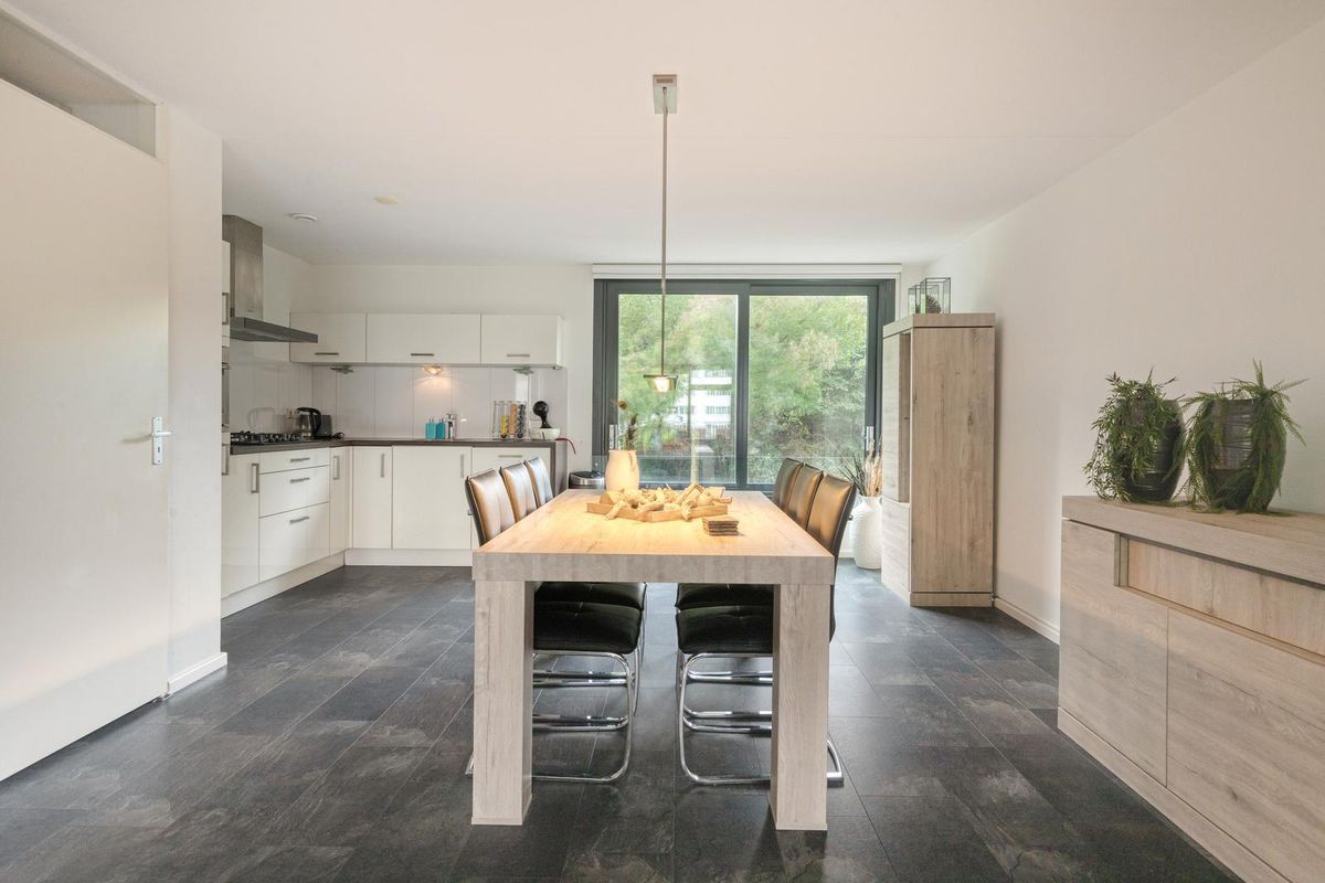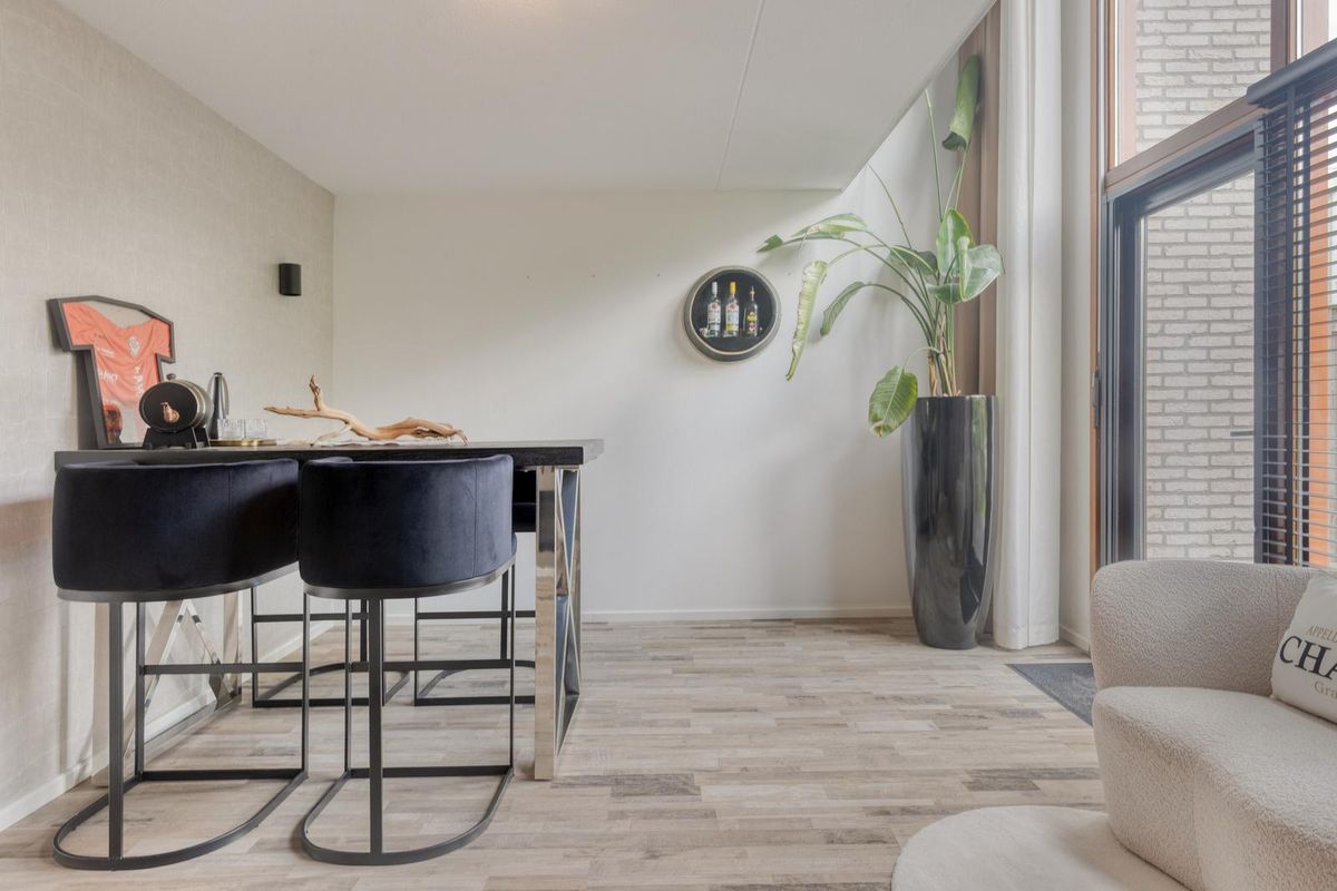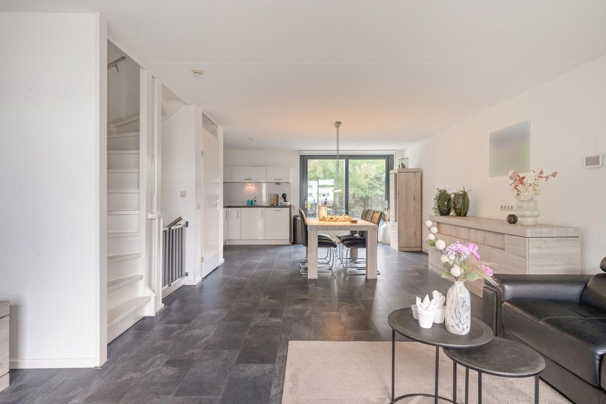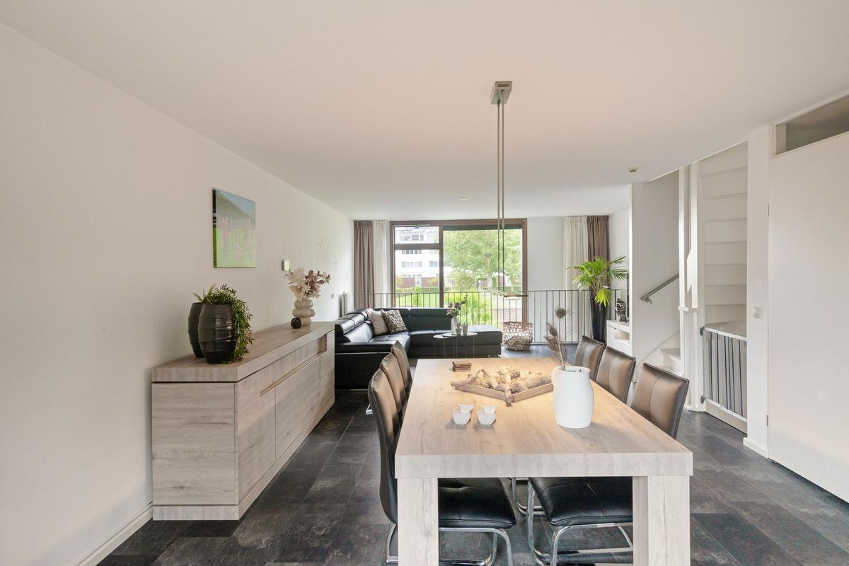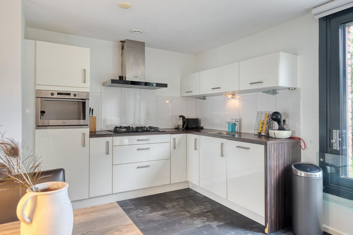 Op de begane grond bevindt zich een knus gedeelte van de woonkamer met uitzicht op de tuin en heerlijk lichtinval door de grote raampartijen. De échte leefruimte vind je echter op de eerste verdieping. Daar bevindt zich de royale woonkamer met plek voor een grote bank én een flinke eettafel. Een bijzonder sfeervol detail is de vide, die zorgt voor een prachtig ruimtelijk effect en een open verbinding met het zitgedeelte op de begane grond. Dankzij deze vide stroomt het daglicht rijkelijk naar binnen en voelt de hele woning heerlijk licht en luchtig aan. Aangrenzend vind je de open keuken, modern wit, strak en functioneel. Met diverse inbouwapparatuur is koken hier een feestje. Doordat de keuken open is, sta je altijd in contact met het gezelschap in de woonkamer.