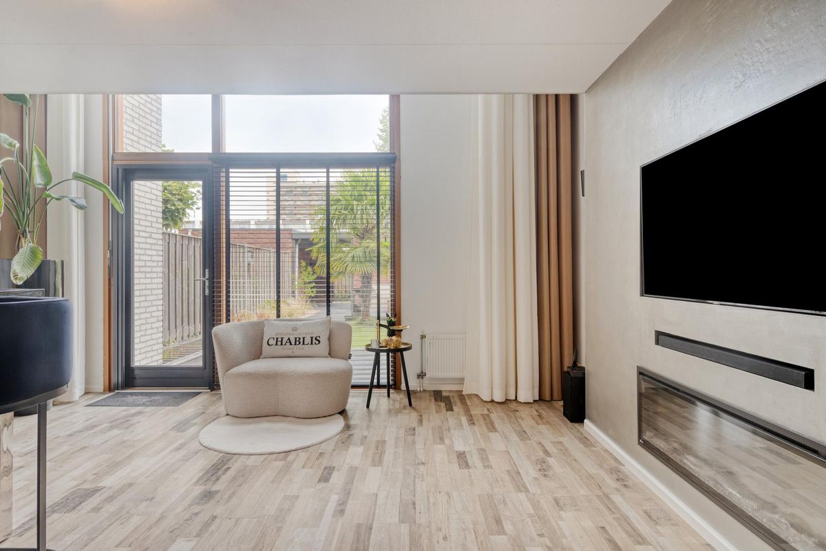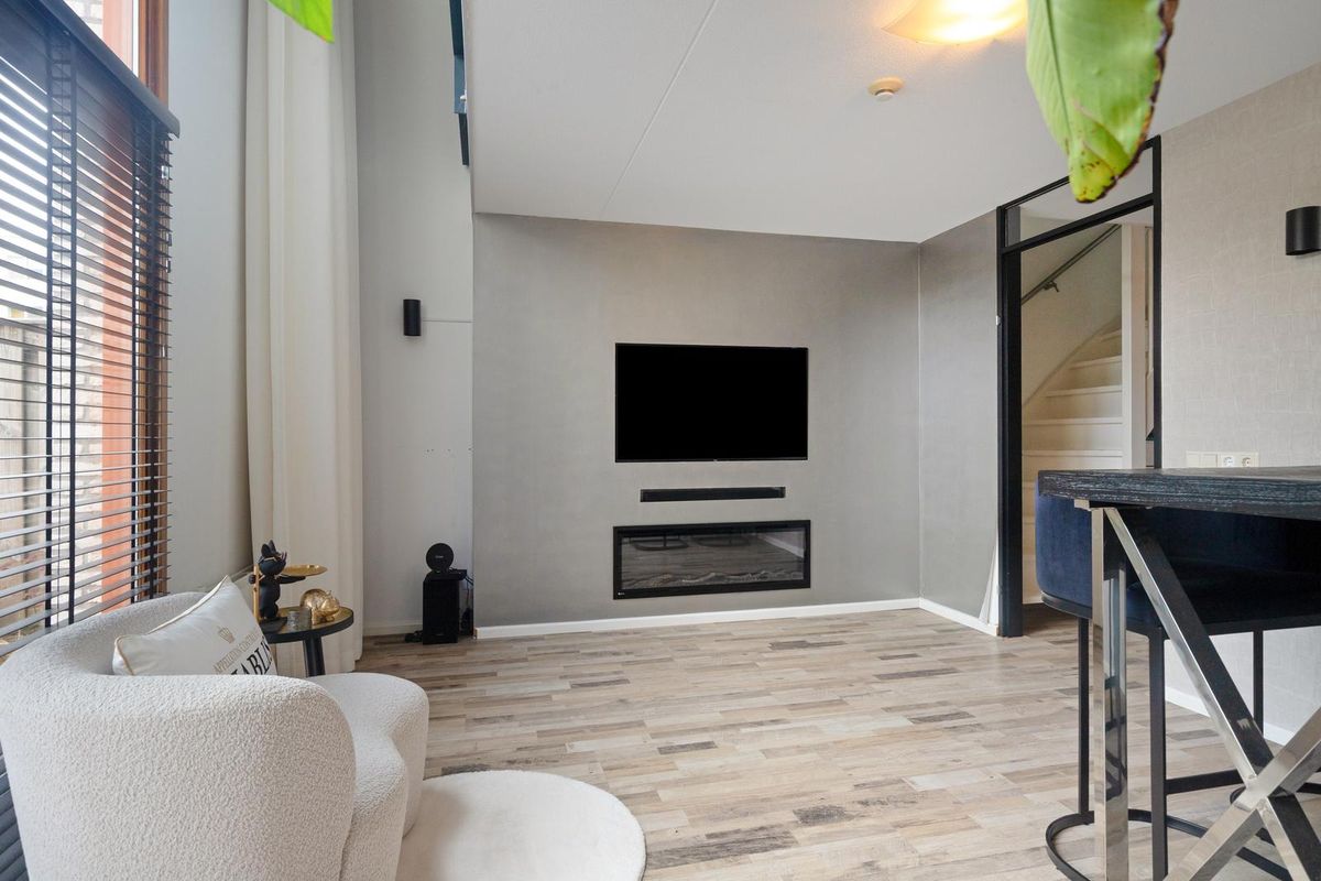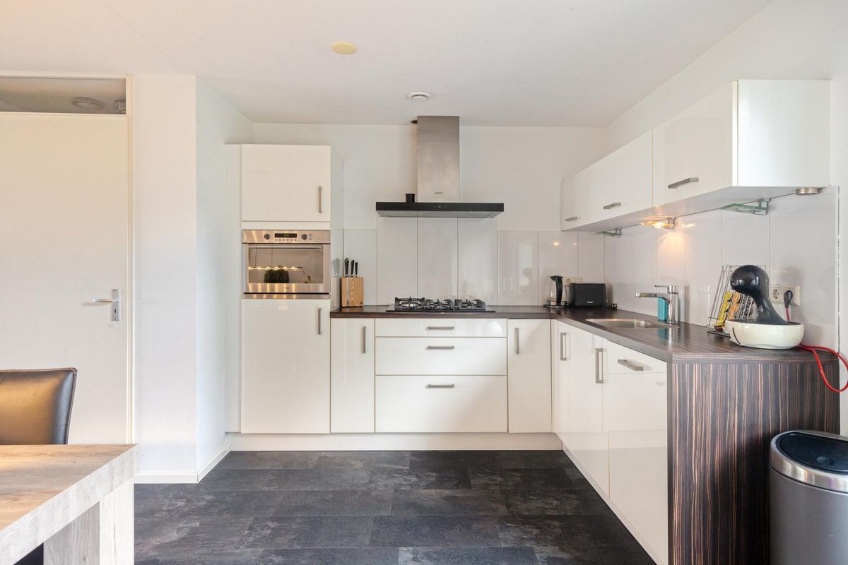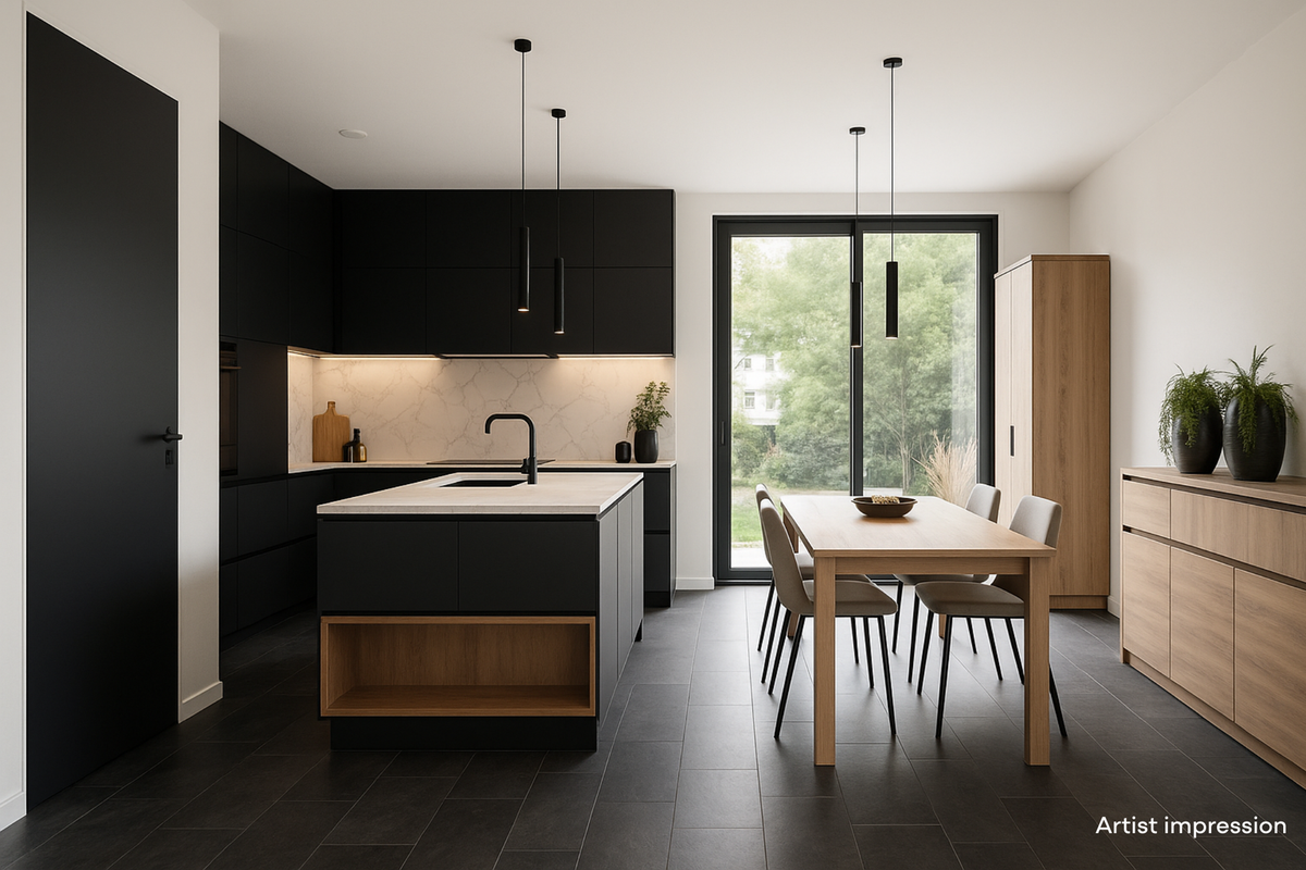 Op de begane grond bevindt zich een knus gedeelte van de woonkamer met uitzicht op de tuin en heerlijk lichtinval door de grote raampartijen. De échte leefruimte vind je echter op de eerste verdieping. Daar bevindt zich de royale woonkamer met plek voor een grote bank én een flinke eettafel. Een bijzonder sfeervol detail is de vide, die zorgt voor een prachtig ruimtelijk effect en een open verbinding met het zitgedeelte op de begane grond. Dankzij deze vide stroomt het daglicht rijkelijk naar binnen en voelt de hele woning heerlijk licht en luchtig aan. Aangrenzend vind je de open keuken, modern wit, strak en functioneel. Met diverse inbouwapparatuur is koken hier een feestje. Doordat de keuken open is, sta je altijd in contact met het gezelschap in de woonkamer.