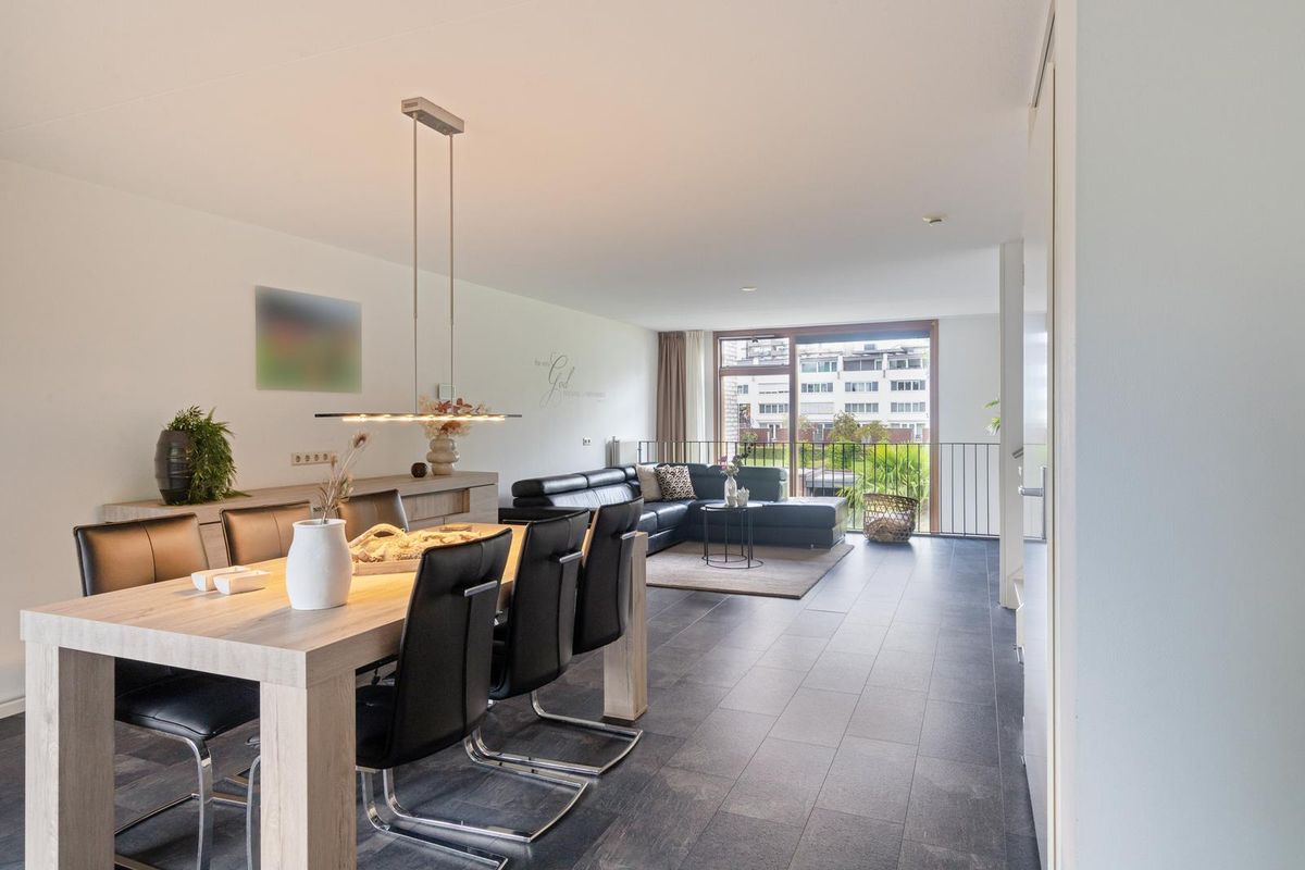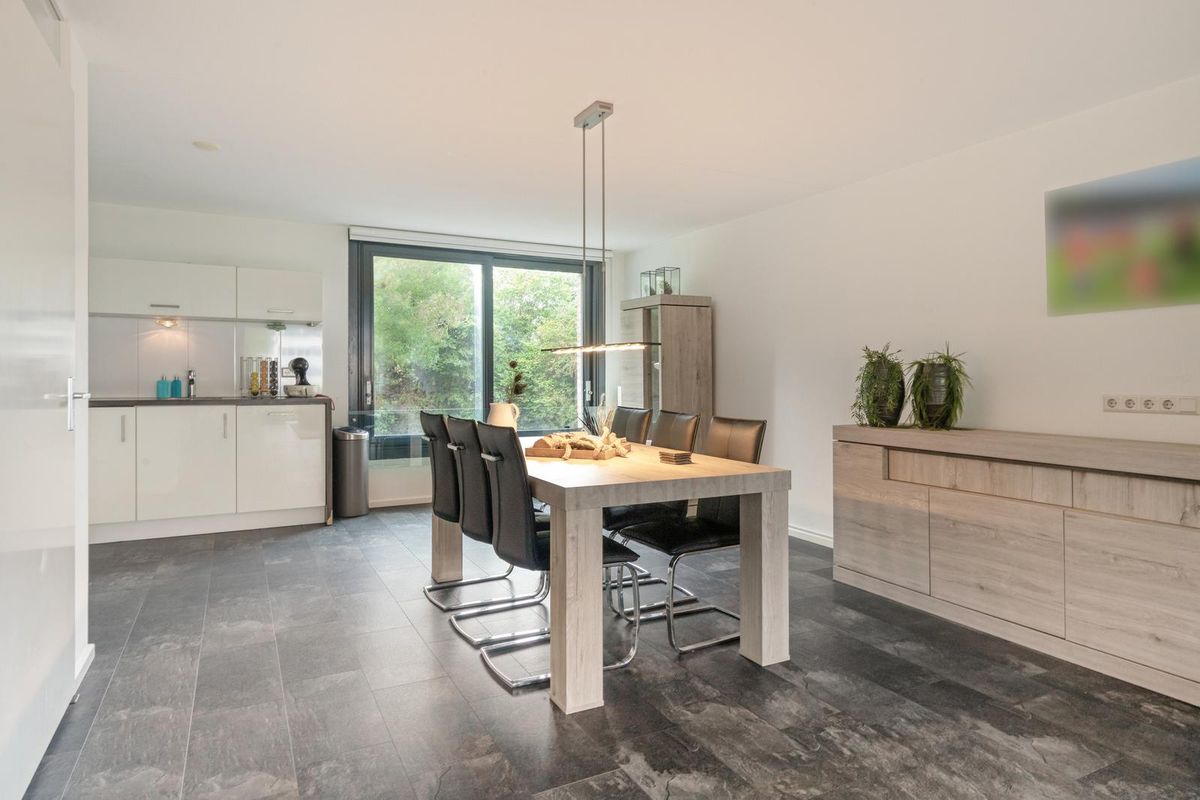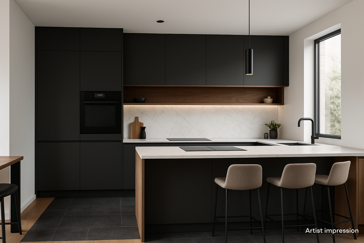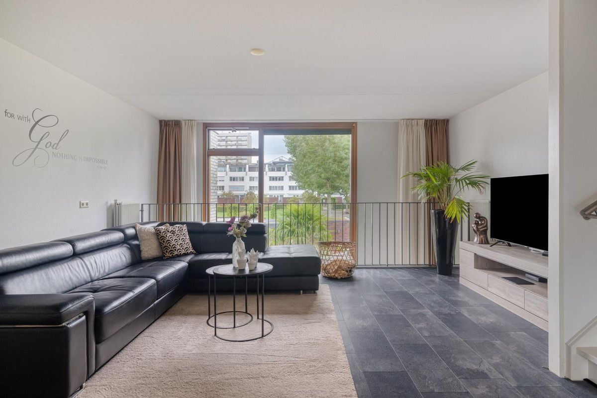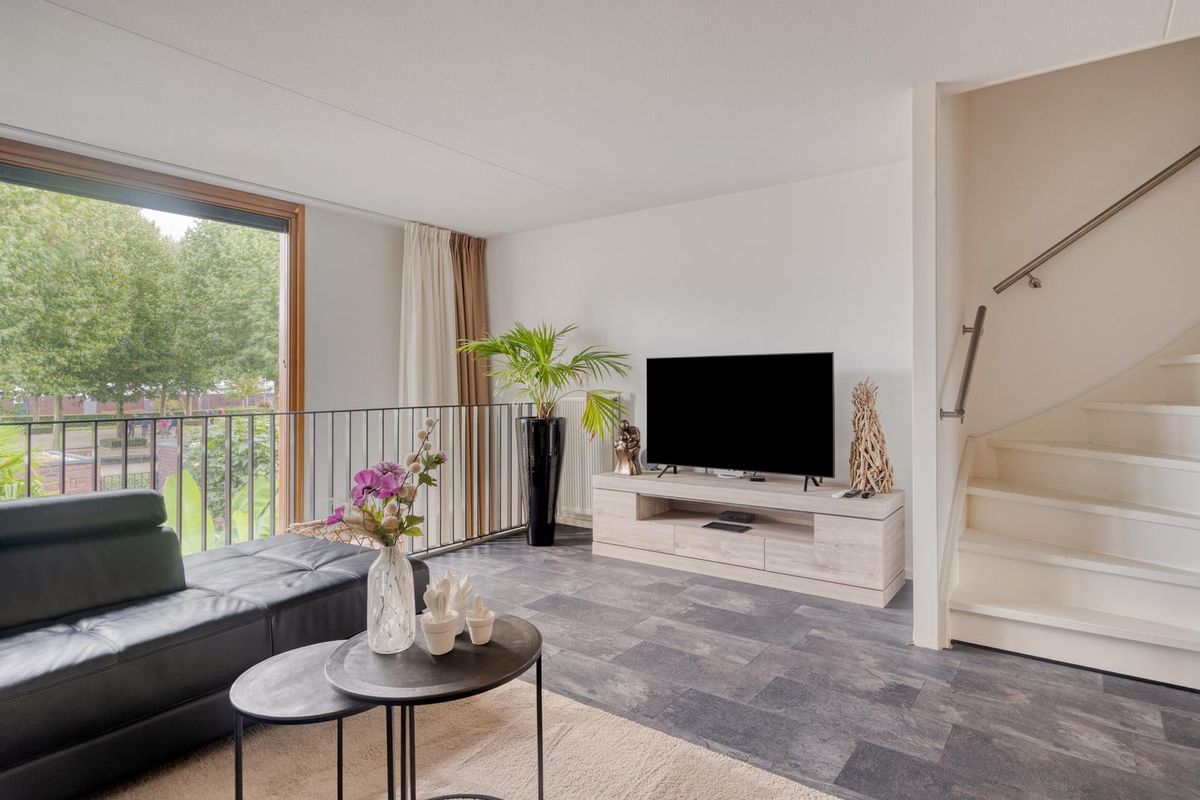 Op de begane grond bevindt zich een knus gedeelte van de woonkamer met uitzicht op de tuin en heerlijk lichtinval door de grote raampartijen. De échte leefruimte vind je echter op de eerste verdieping. Daar bevindt zich de royale woonkamer met plek voor een grote bank én een flinke eettafel. Een bijzonder sfeervol detail is de vide, die zorgt voor een prachtig ruimtelijk effect en een open verbinding met het zitgedeelte op de begane grond. Dankzij deze vide stroomt het daglicht rijkelijk naar binnen en voelt de hele woning heerlijk licht en luchtig aan. Aangrenzend vind je de open keuken, modern wit, strak en functioneel. Met diverse inbouwapparatuur is koken hier een feestje. Doordat de keuken open is, sta je altijd in contact met het gezelschap in de woonkamer.