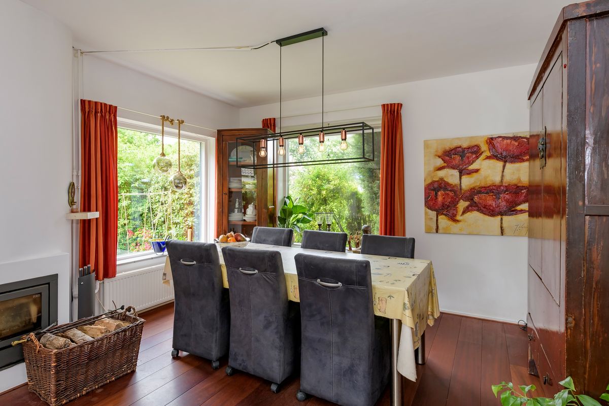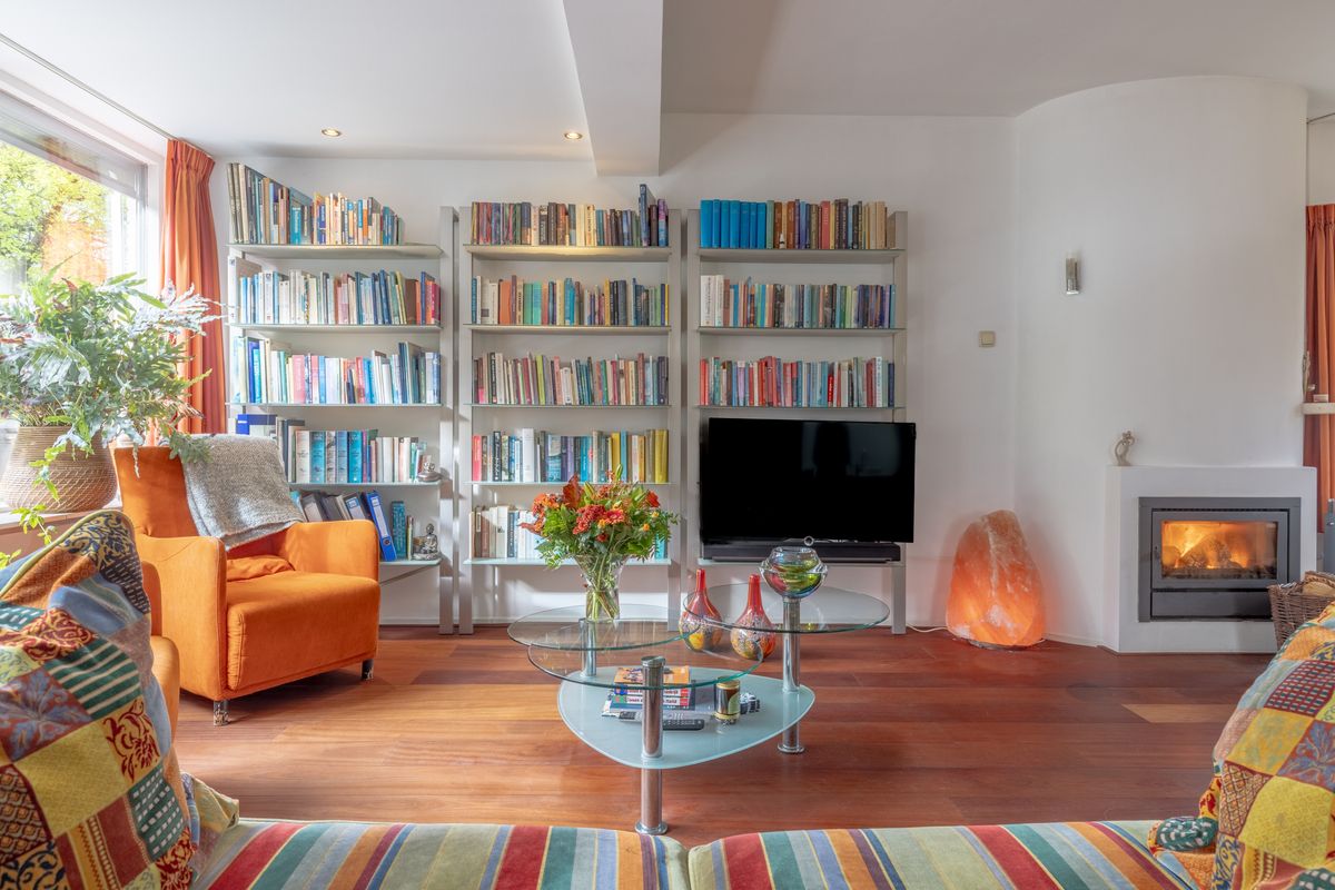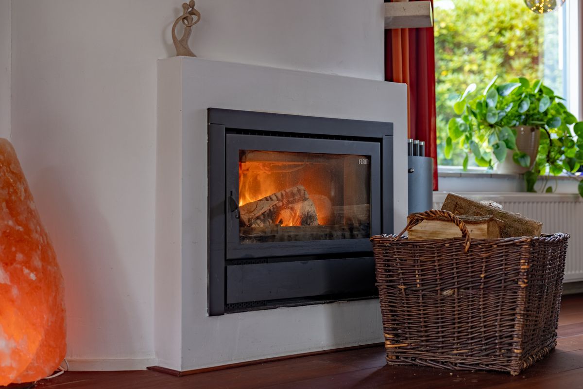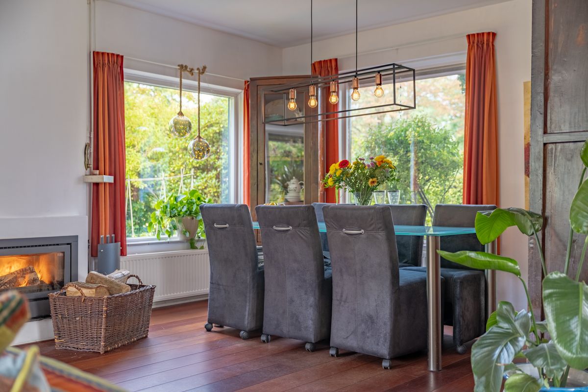 Royale, lichte woonkamer met hardhouten vloer (Jatoba) en sfeervolle houtkachel met ventilatorsysteem.