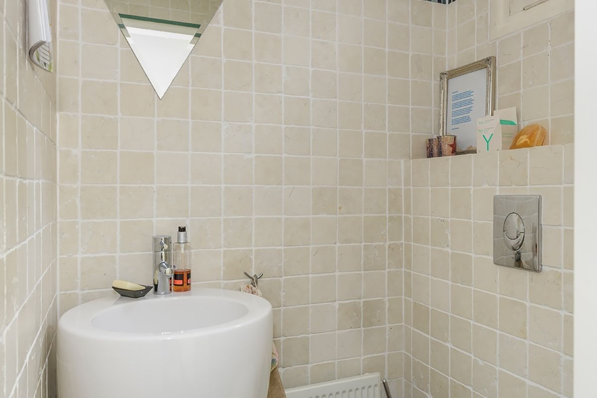 Entree/hal met toilet en designfontein (Alessi), trapopgang en toegang tot kelder (ca. 13 m², ideaal als provisie- of wijnkelder).