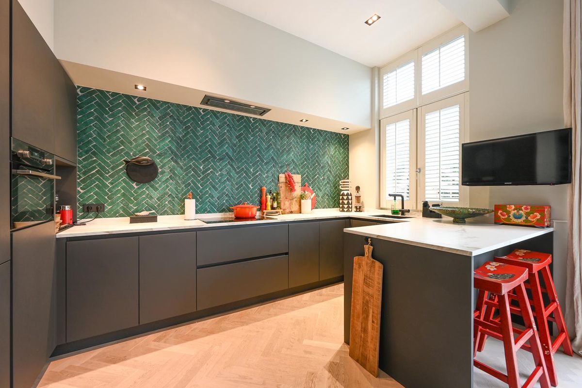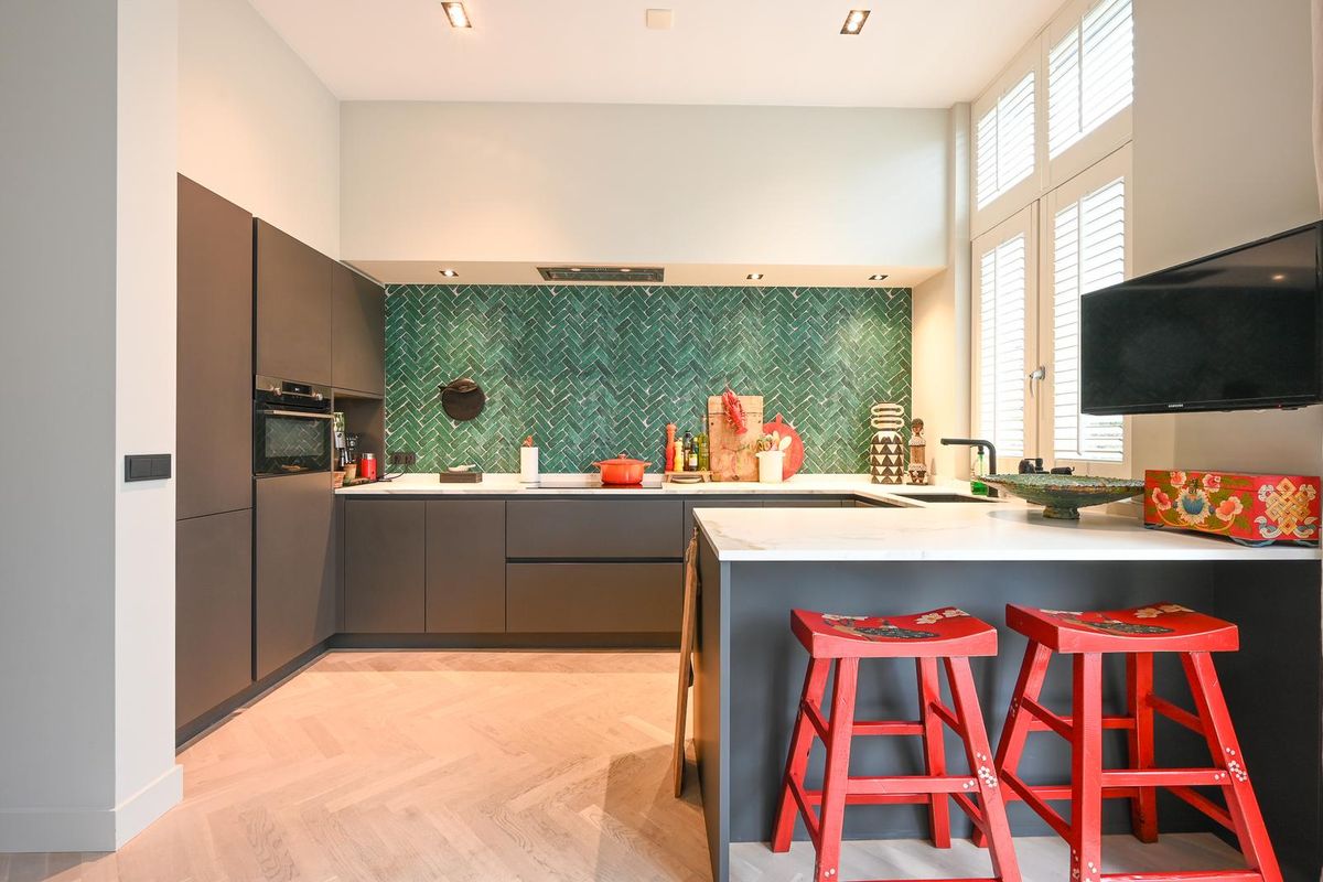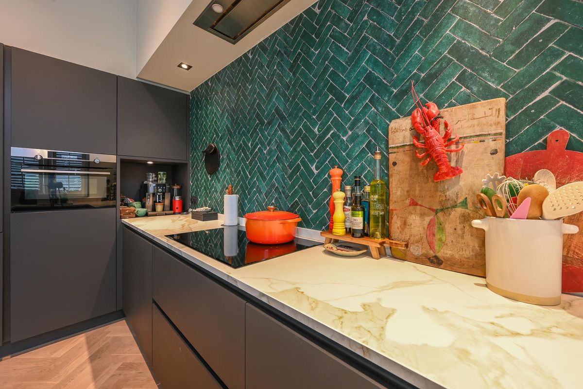 De keuken in U-opstelling is voorzien van een composiet werkblad, inductiekookplaat, afzuigkap, koel-/vriescombinatie, vaatwasser, combi-magnetron en een ontbijtbar met barkrukken. Handig is de nis voor koffiemachine en waterkoker.