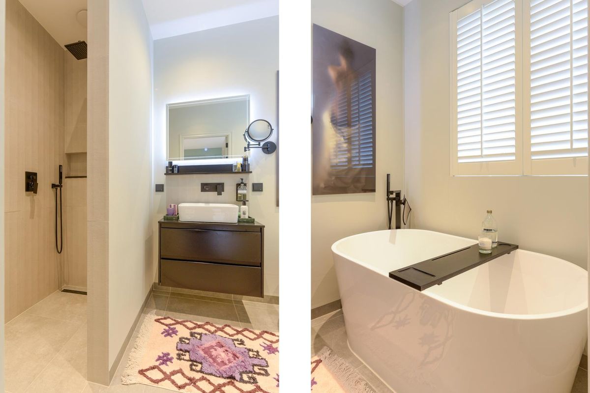 Luxe en complete badkamer die uitgerust is met een inloopdouche, breed wasmeubel met waskom en sfeerverlichting in de handige nis.