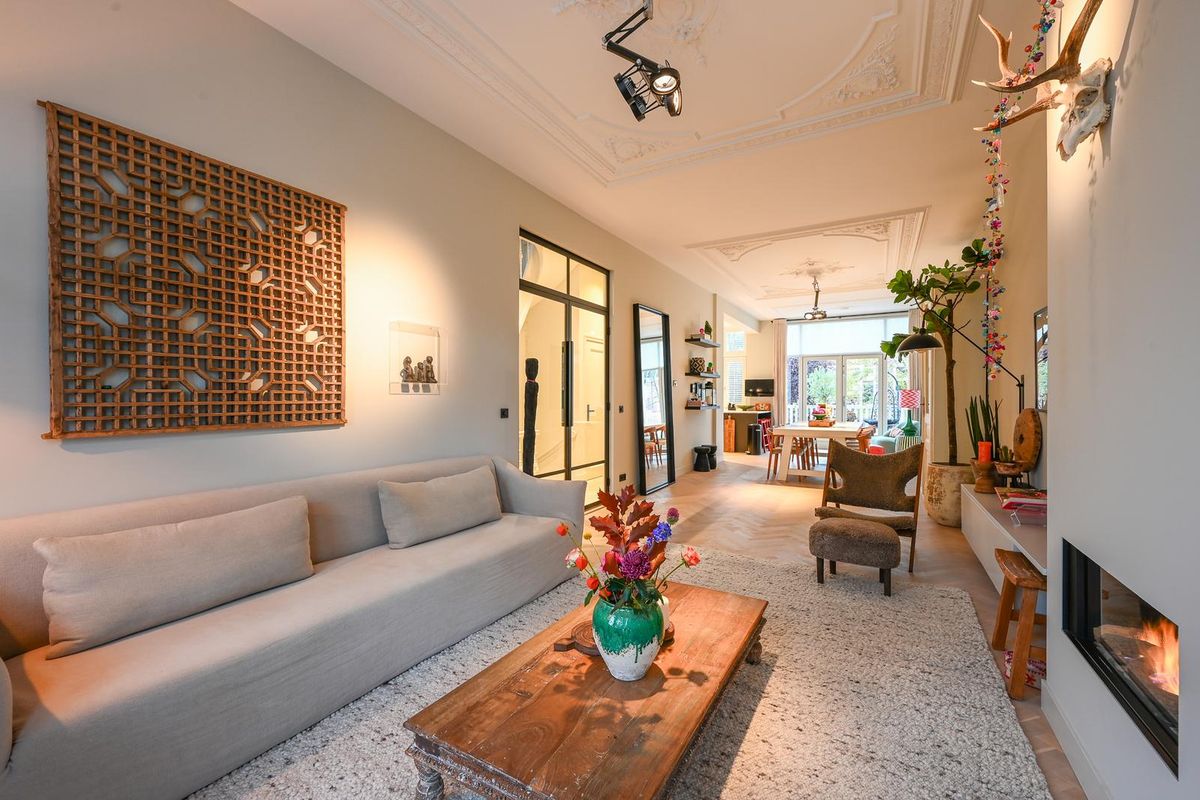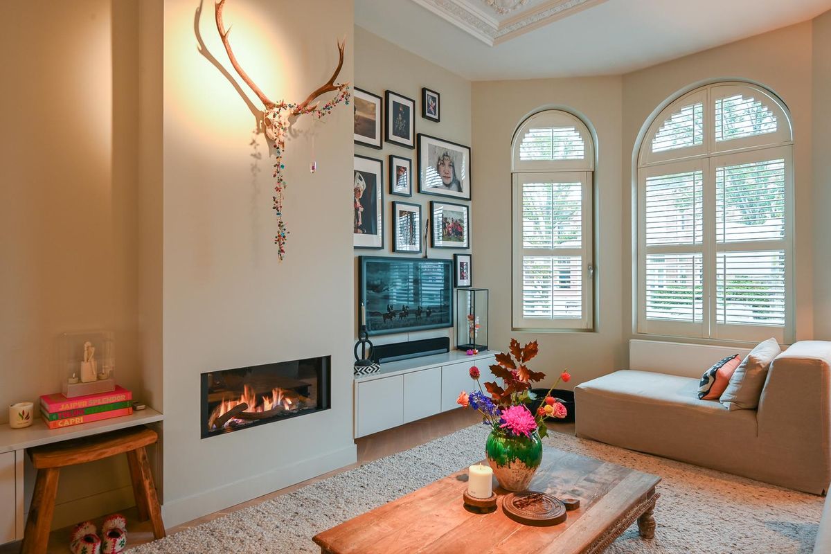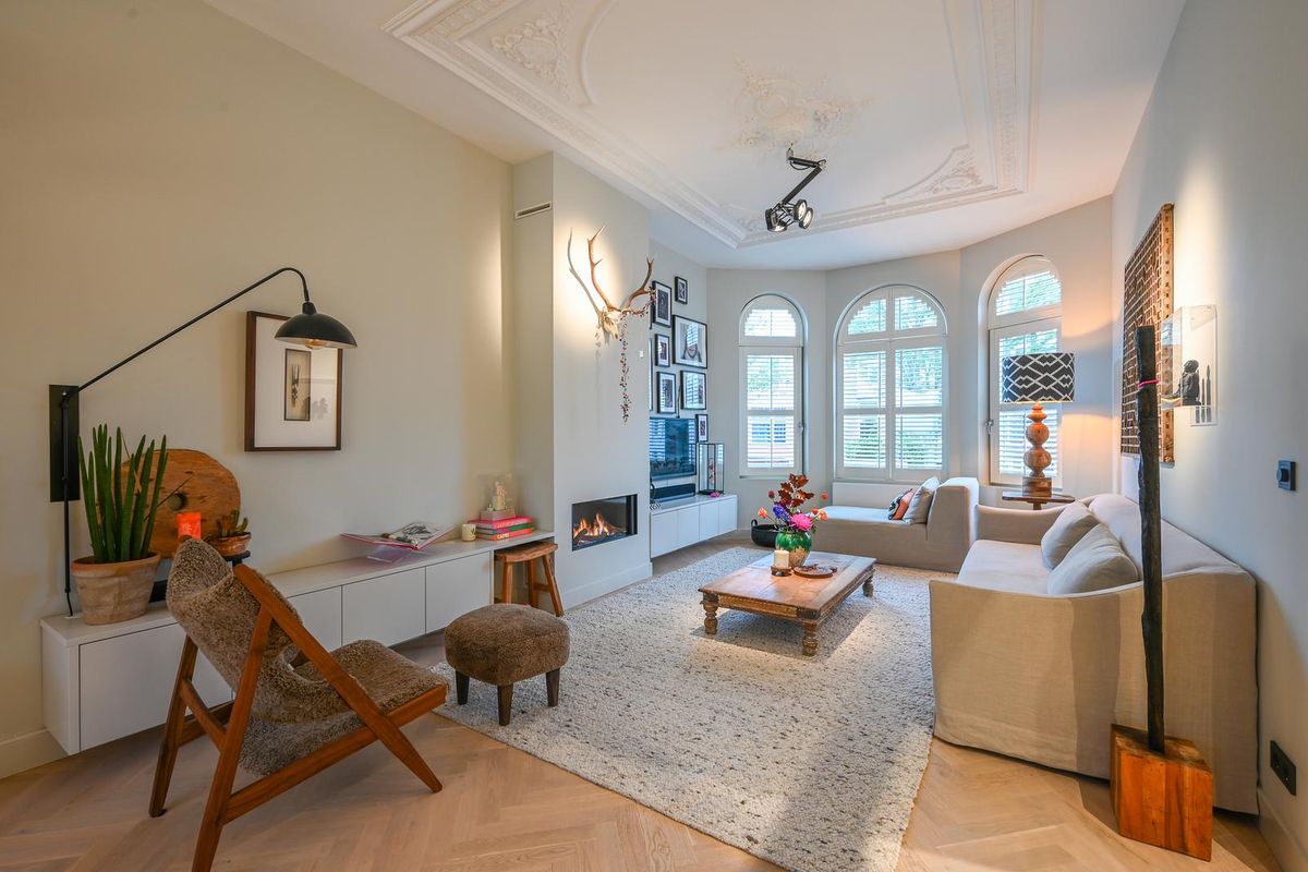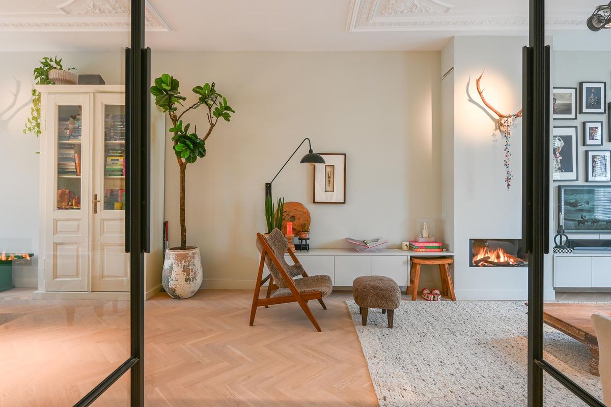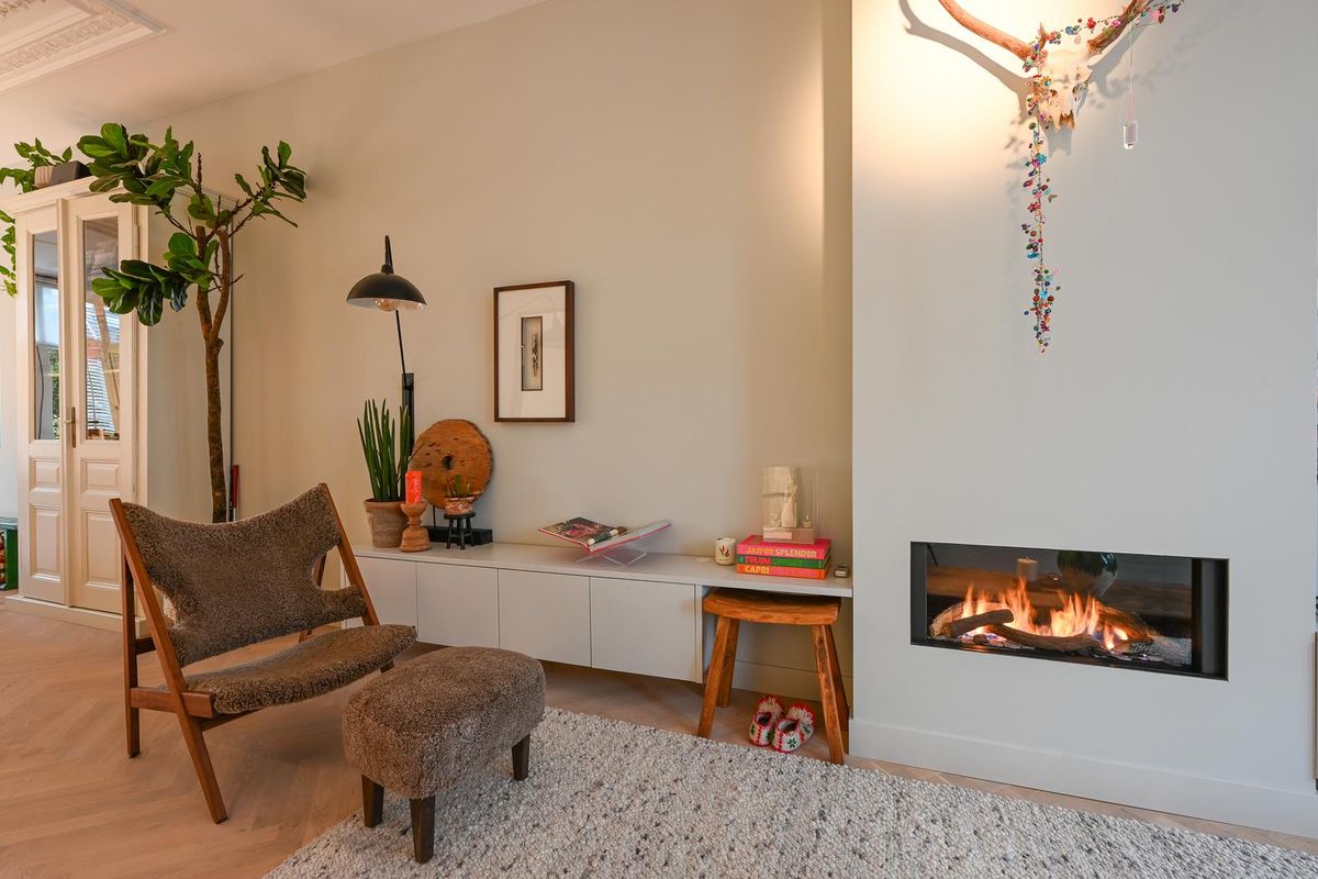 1e verdieping: fijne overloop met veel lichtinval door de trendy dubbele stalen deuren naar de woonkamer. Vaste kast met opstelplaats voor een cv-ketel (Remeha 2019) en meterkast (12 groepen). Modern toilet welke is voorzien van een hangcloset, inbouwreservoir en een fonteintje. Door de dubbele deuren naar de woonkamer een ruimtelijk gevoel en prettig lichtinval op overloop en in het trappenhuis. Sfeervolle en royale woonkamer waar alles samen valt met fraaie vloer, wand- en plafonafwerking. Fantastische living aan de voorzijde van het appartement waar het knus genieten is met de gashaard en het straatbeeld door de erker met smaakvolle halfronde raampartijen.