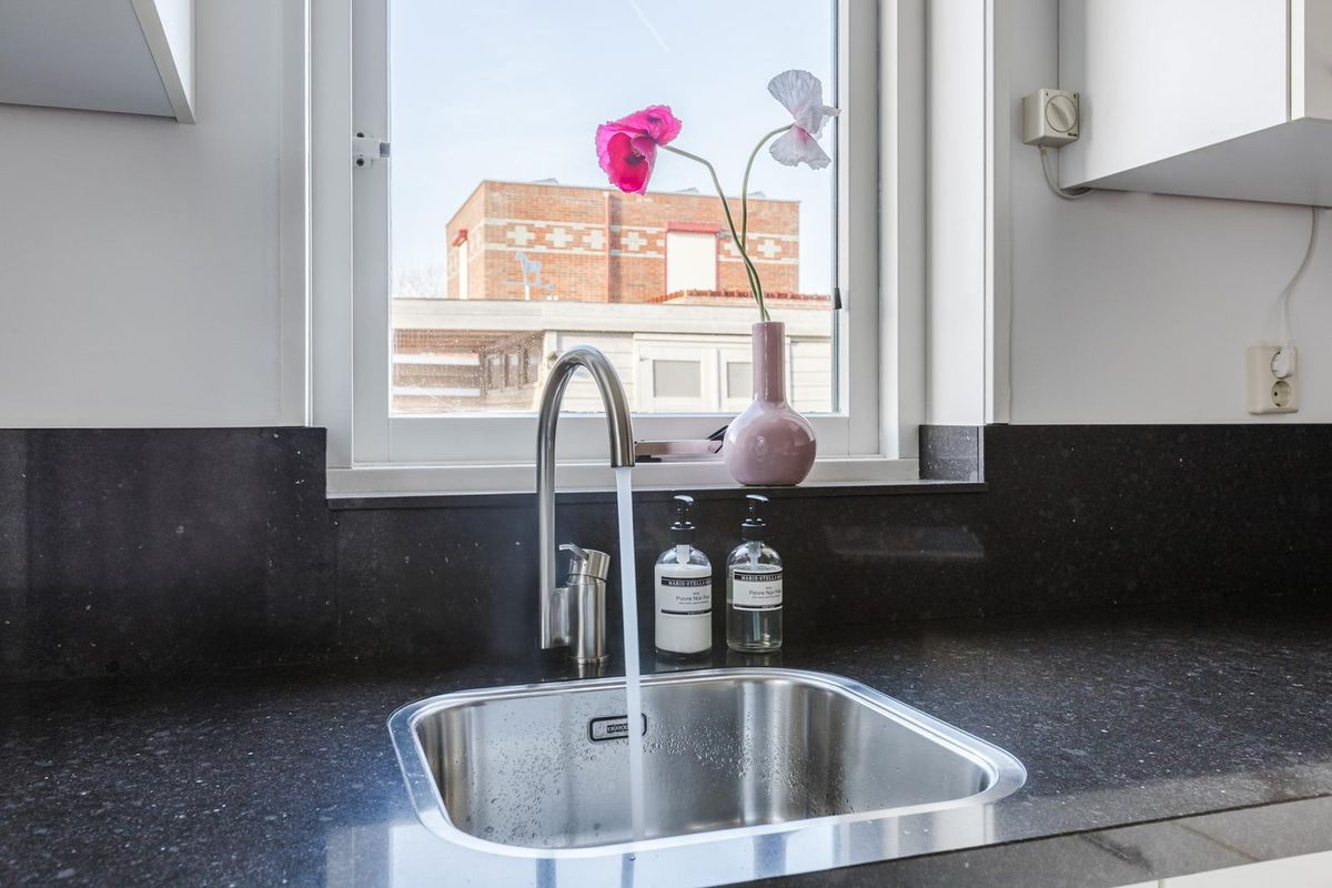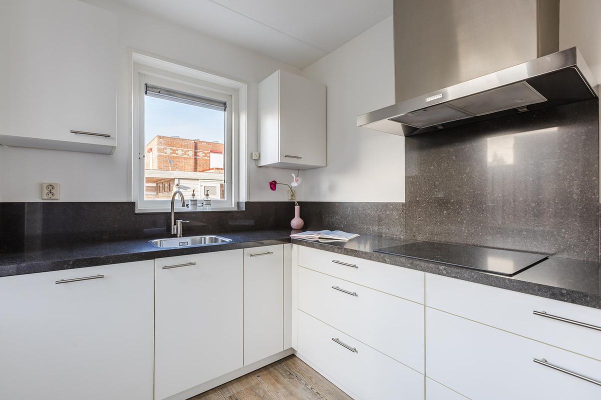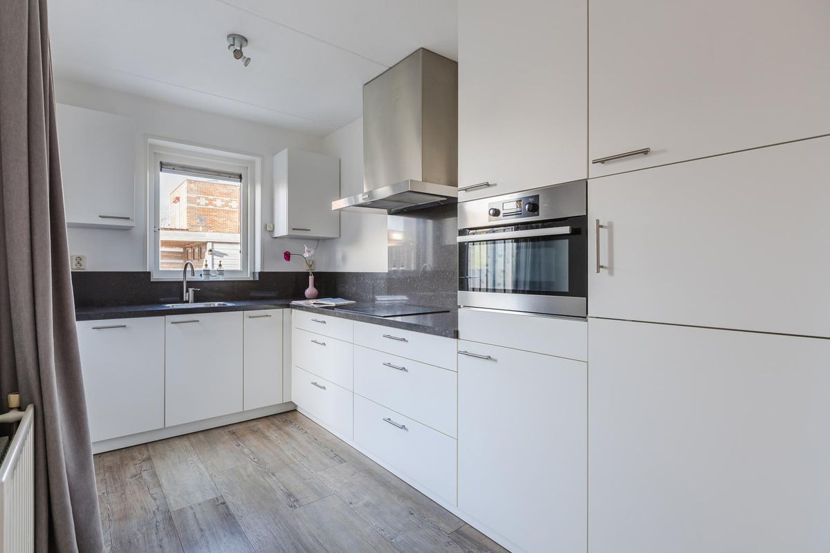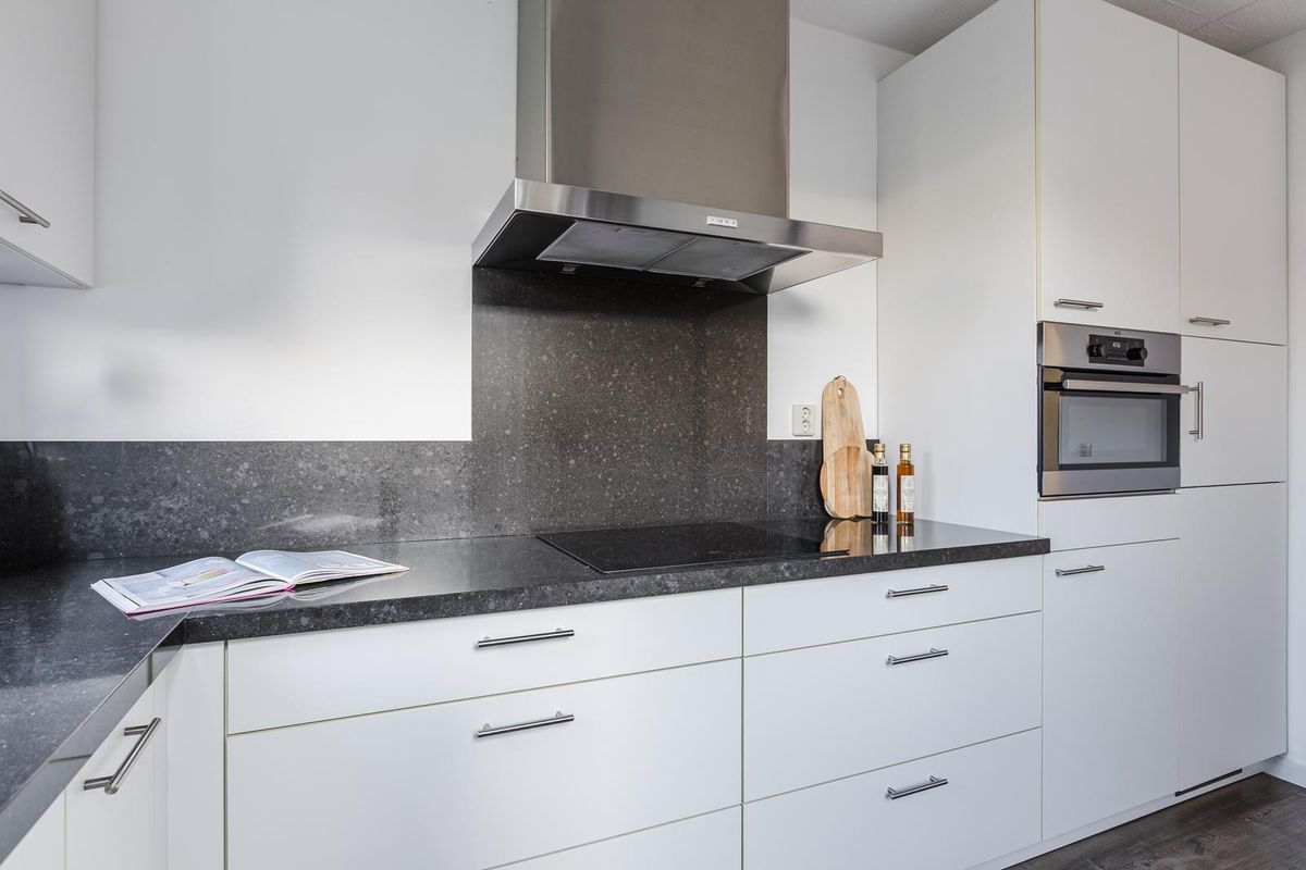 De moderne halfopen keuken met een pvc vloer beschikt over een composiet aanrechtblad en inbouwapparatuur: Inductie kookplaat, afzuigkap, combi-oven, koelkast en vaatwasser Via de keuken komt u in de achtertuin.