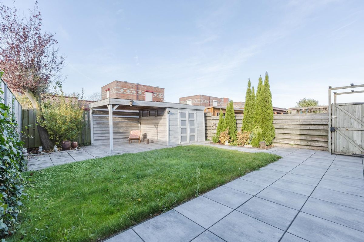 De tuin is onderhoudsvriendelijk en beschikt over een garage en een tuinhuis met overkapping. Er is deels een duurzame schutting en er is een vrij achterom.