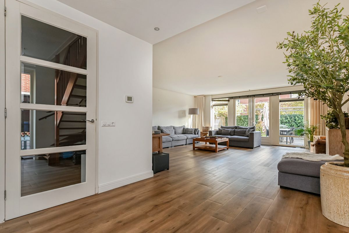 It’s lovely coming in here: the thing that immediately catches your eye is the spacious hallway with a toilet, meter cabinet and stairs leading to the first floor. The hallway grants you access to the spacious, extended living room with large windows and a double door leading to the backyard. The walls and floor have been expertly finished off. The modern kitchen, located in the front of the house, has been renewed in 2023 and is fitted with a Bora induction cooktop, a fridge freezer, dishwasher and a combi microwave.