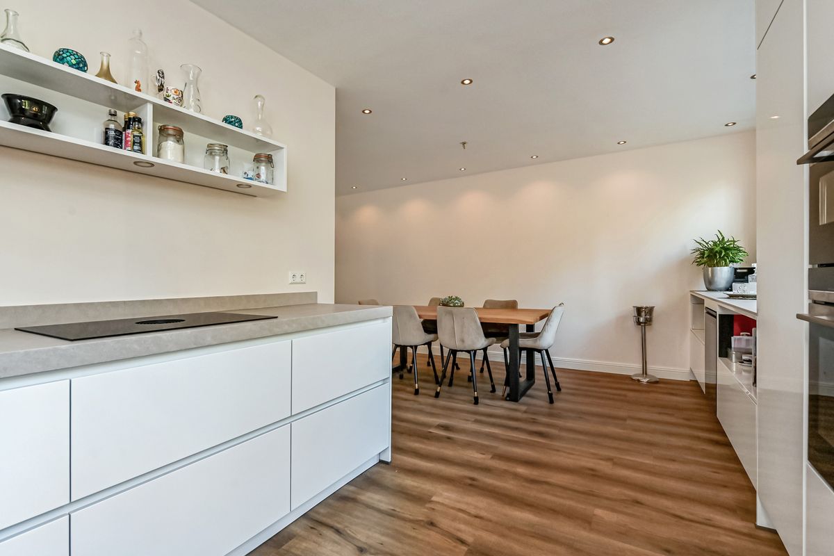 Het is heerlijk binnenkomen: wat direct opvalt is de ruime hal met meterkast, toilet en trapopgang naar de 1e verdieping. Vanuit de hal toegang tot de royale uitgebouwde living met grote raampartijen en dubbele deuren naar de achtertuin. Wanden en vloeren zijn strak afgewerkt. Aan de voorzijde de moderne keuken welke in 2023 is vernieuwd en is voorzien van Bora inductiekookplaat, koelvrieskast, vaatwasser, wijnkast en combi-magnetron en oven.