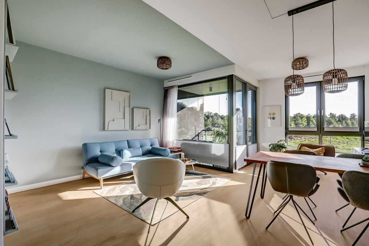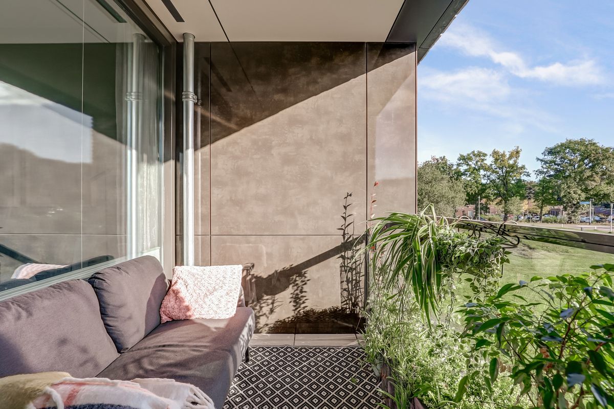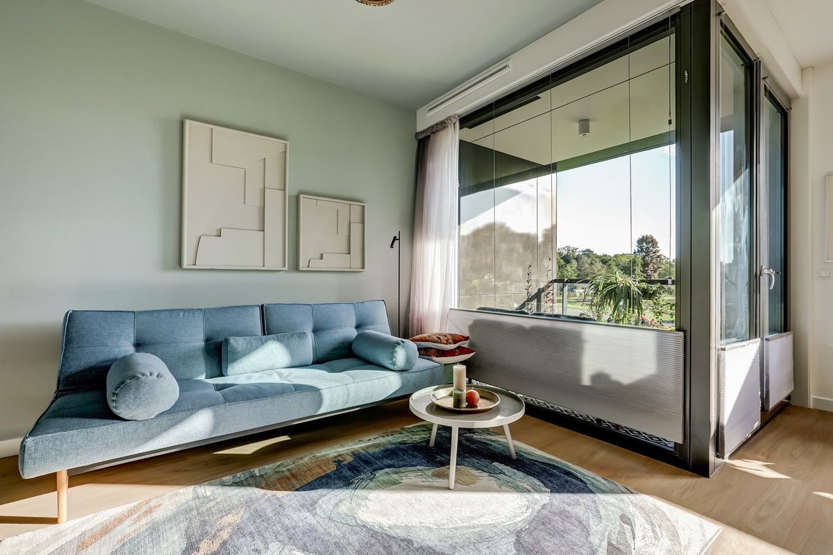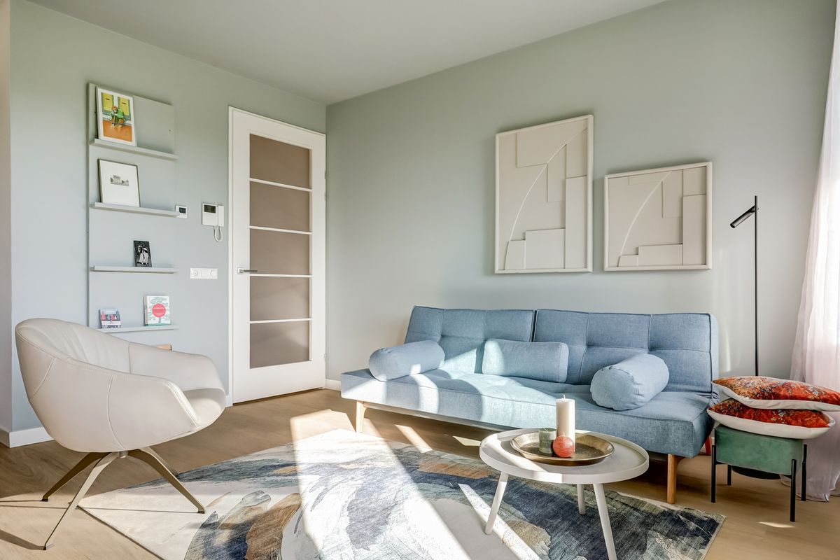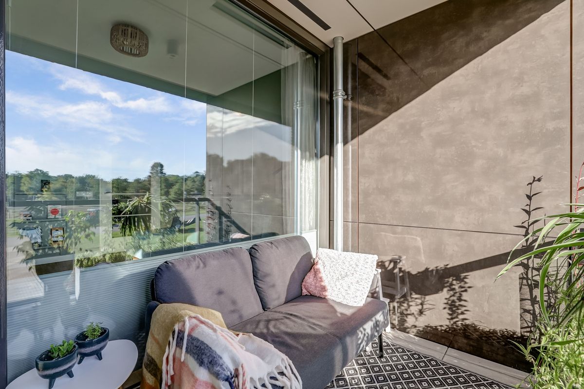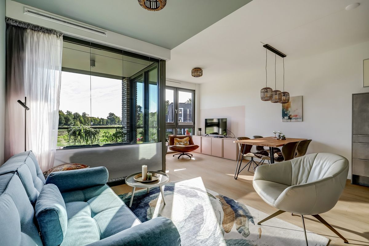 De glazen deuren laten al het licht door naar de royale en lichte woonkamer. De woonkamer geeft toegang tot het balkon en heeft een fraai en groen uitzicht. Er is een mooie open keuken voorzien van diverse A-merk inbouwapparatuur. Het appartement is volledig geïsoleerd en beschikt over een definitief energielabel A.