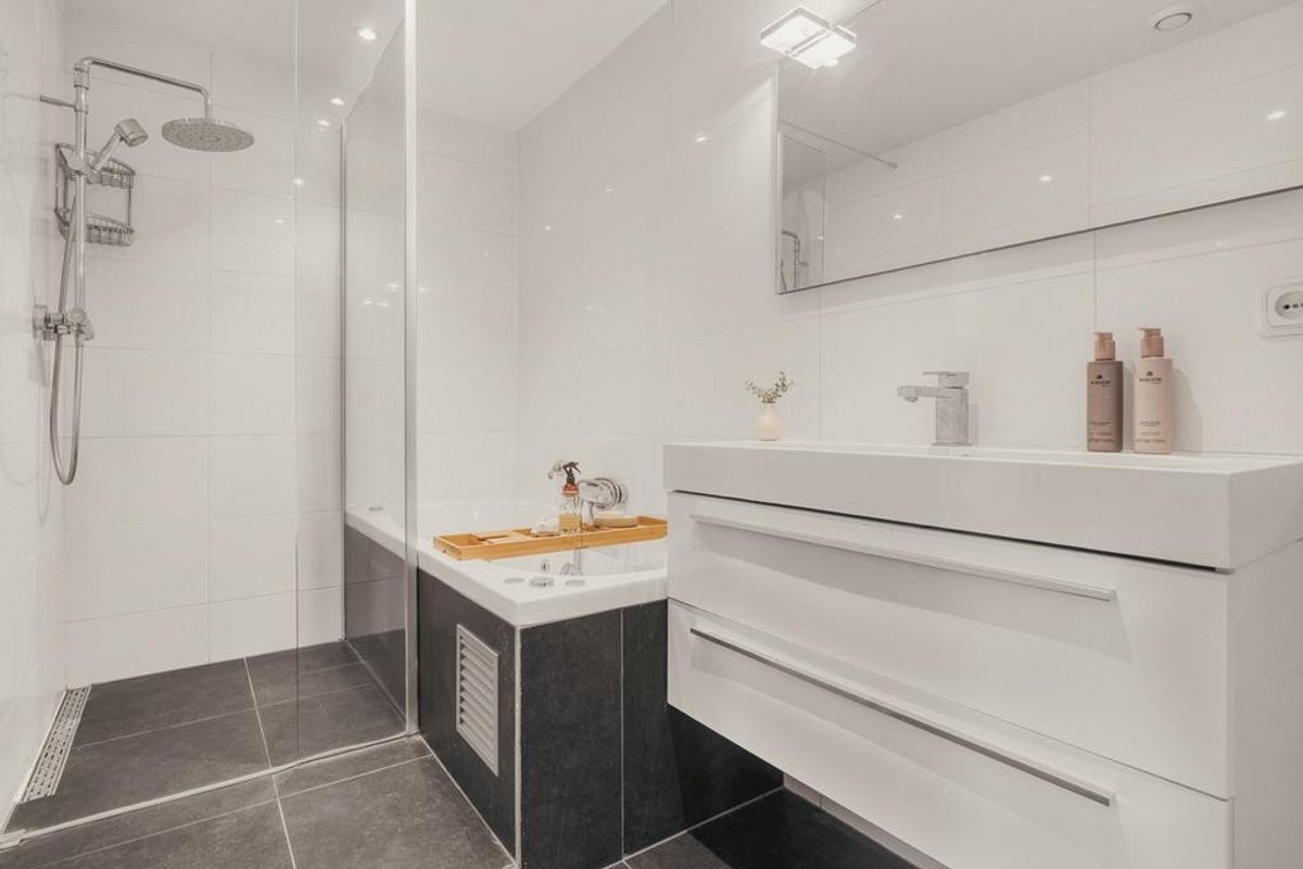 De moderne badkamer is strak afgewerkt en voorzien van een inloopdouche, ligbad, wastafel en stijlvol wastafelmeubel. Daarnaast beschikt de woning over een separaat toilet met fontein en een praktische wasruimte.
