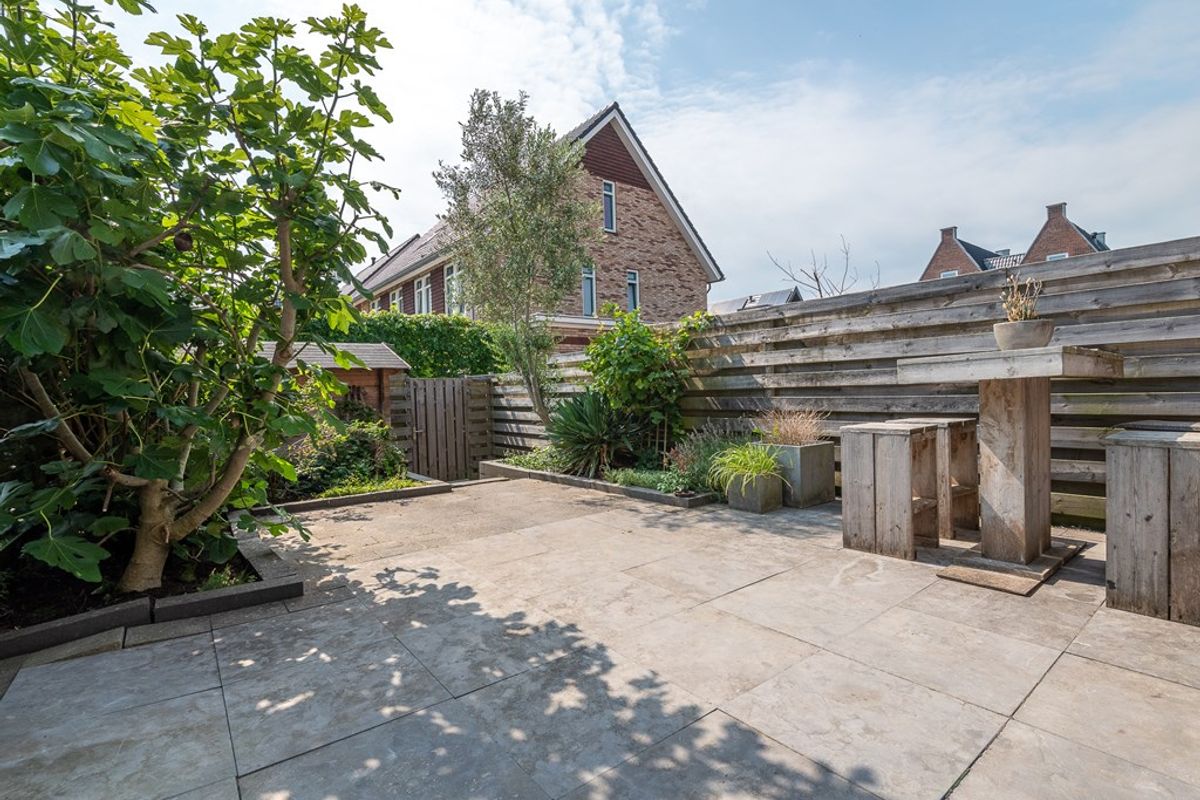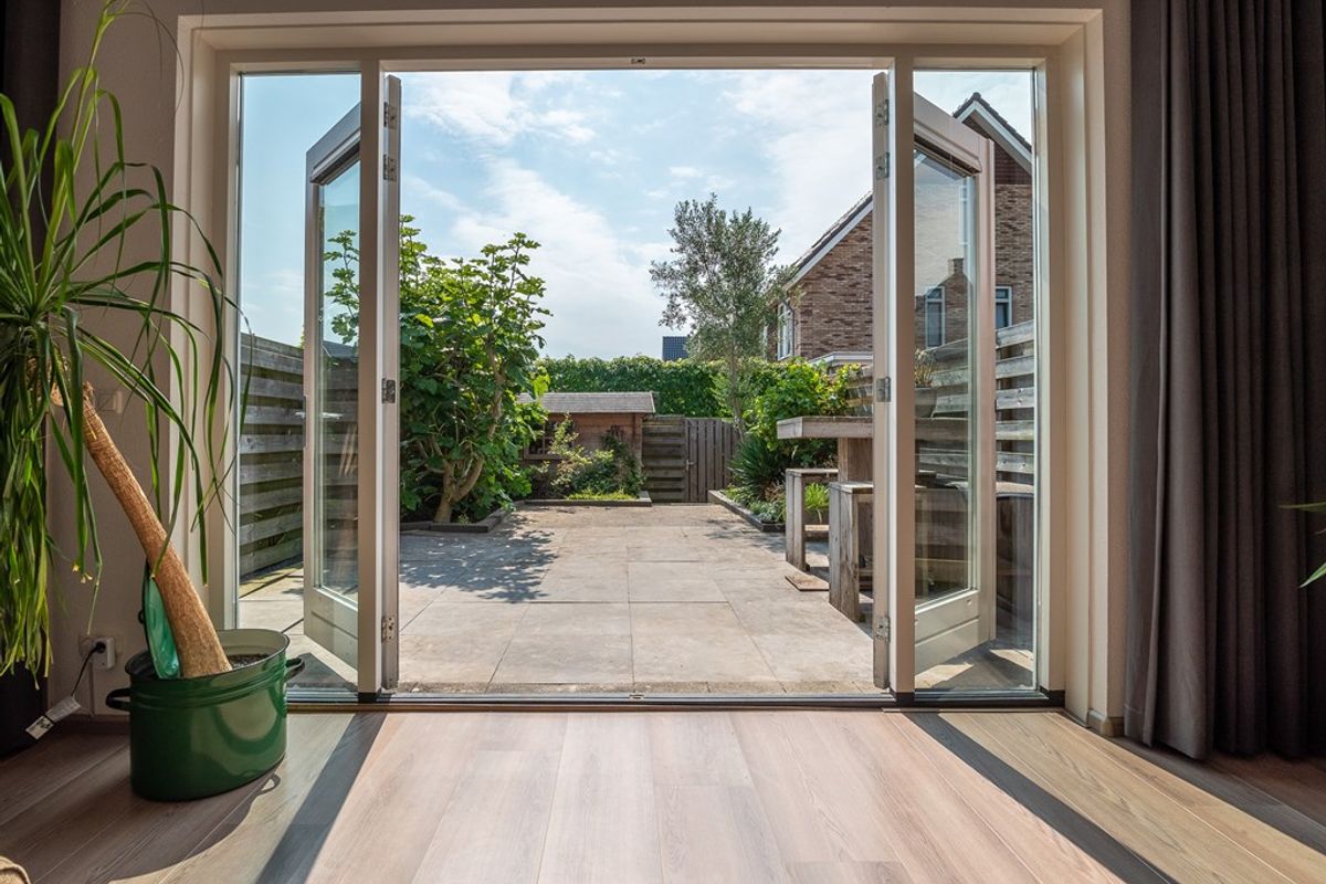 - zonnige achtertuin met schuur