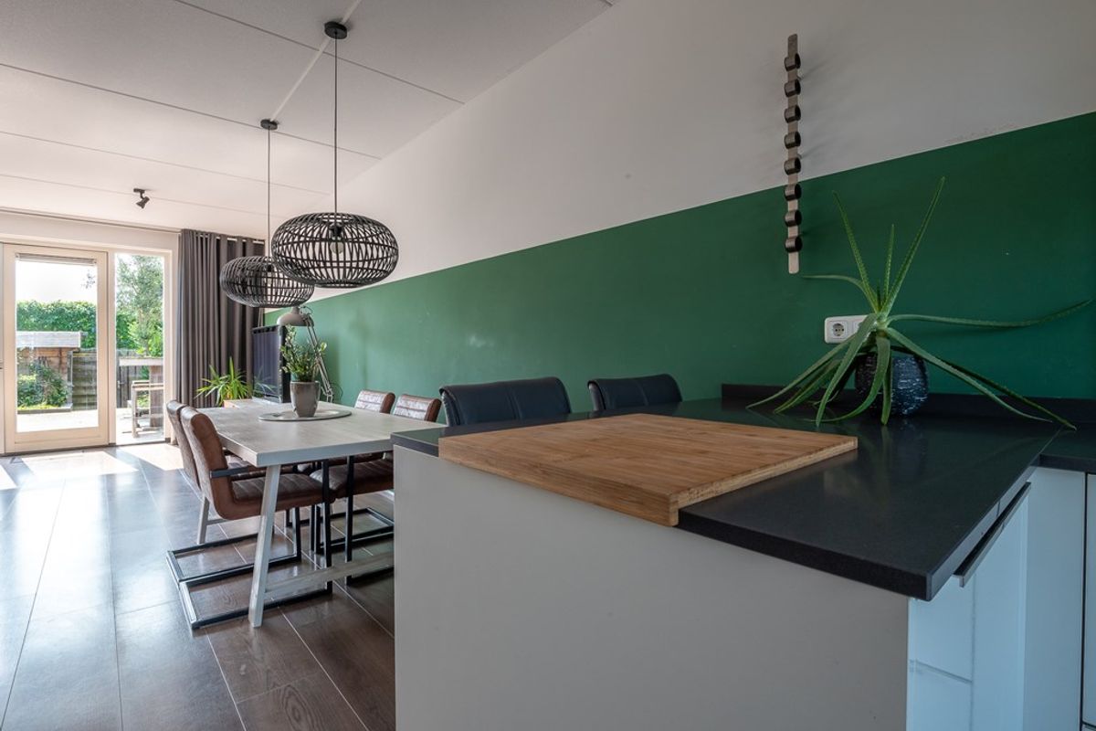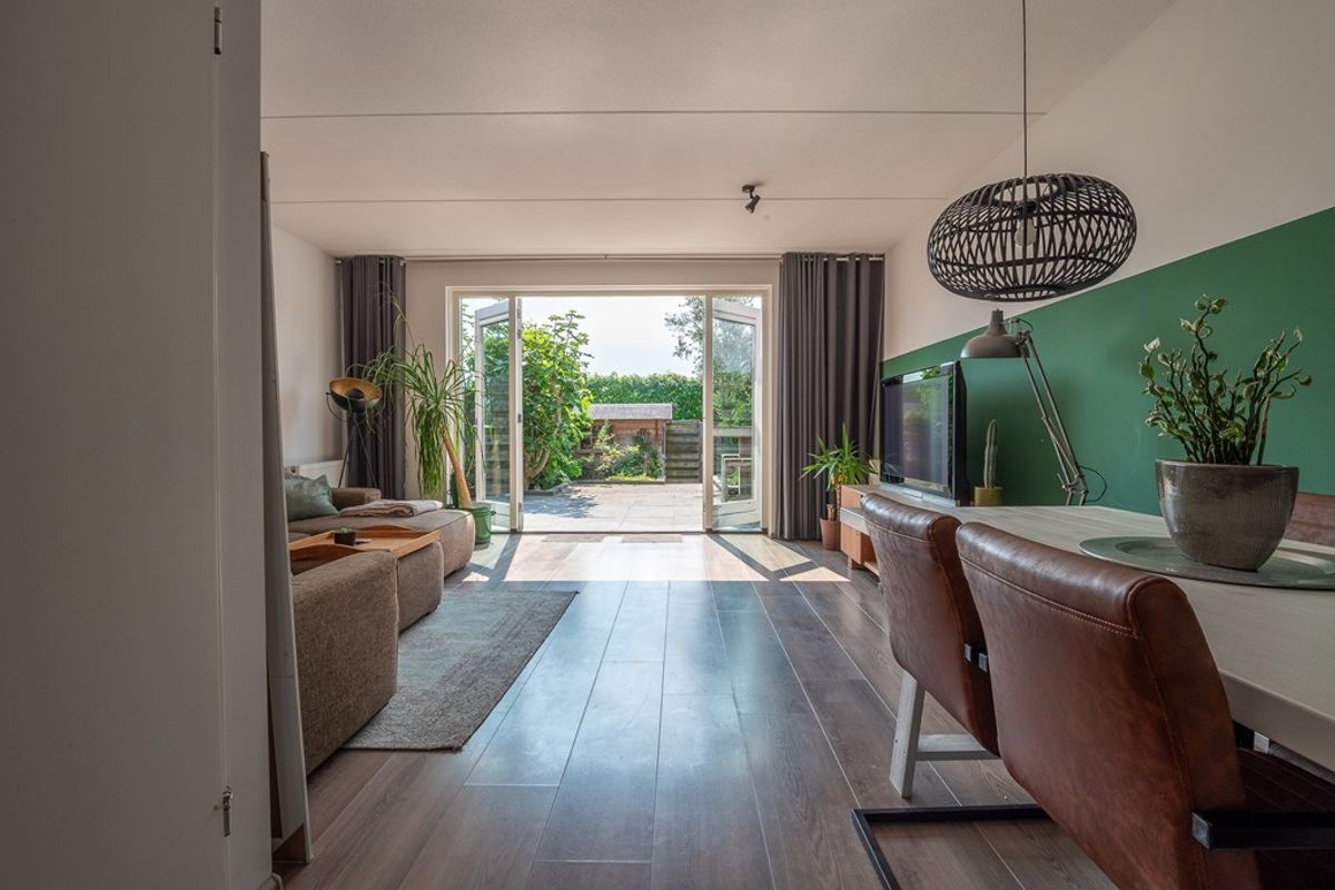 Begane grond: entree/hal met toilet, moderne keuken (v.v. diverse inbouwapparatuur), tuingerichte woonkamer met openslaande deuren naar de achtertuin met schuur en achterom