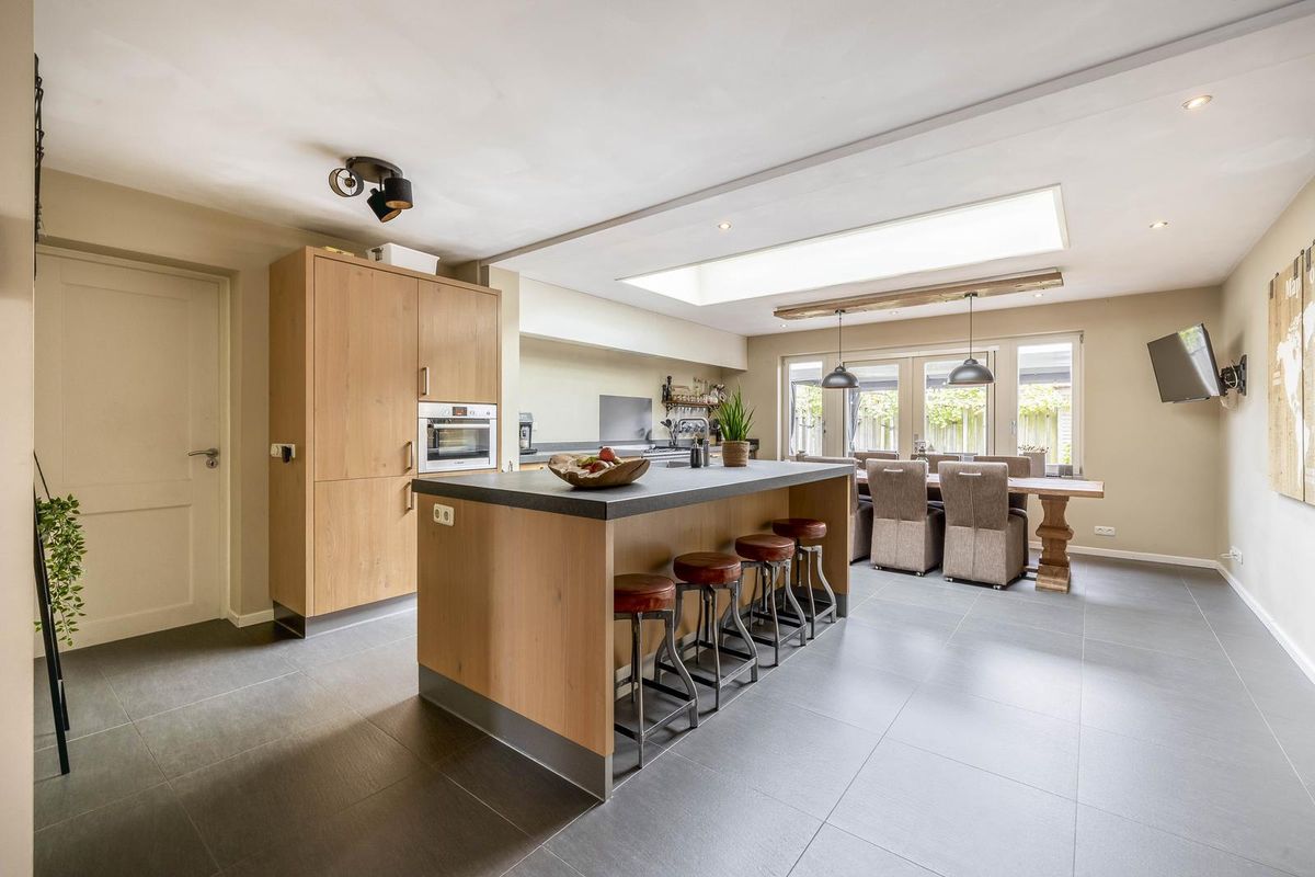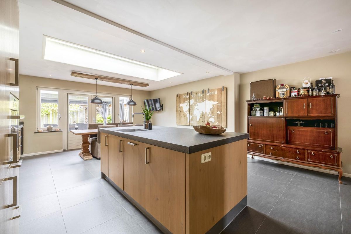 De ruime woonkamer is voorzien van een massief eiken vloer. De houtkachel zorgt voor veel sfeer. In 2015 is de royale aanbouw gerealiseerd die in open verbinding staat met de woonkamer. In deze aanbouw ligt een moderne tegelvloer met vloerverwarming. De grote glazen pui met terrasdeuren alsmede de lichtstraat zorgen voor een fijne lichtinval. In deze ruimte is veel aandacht geschonken aan de keuken.