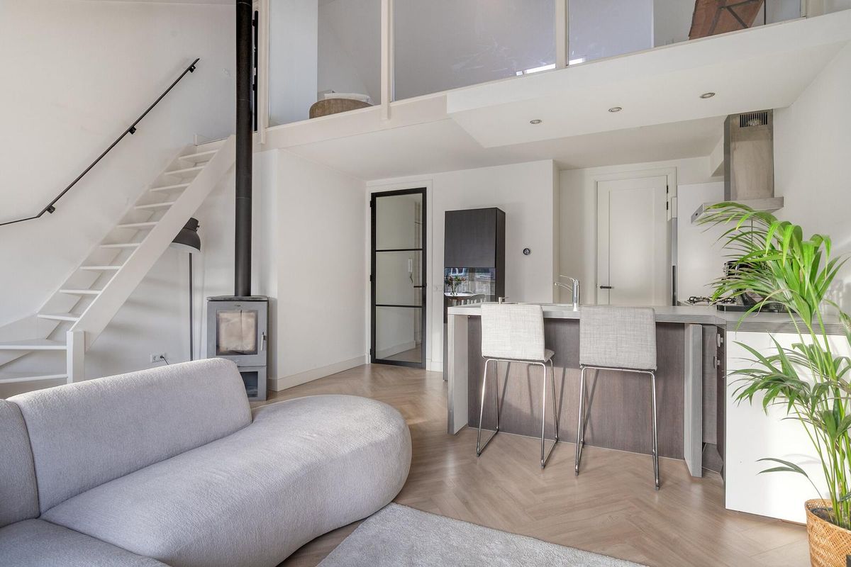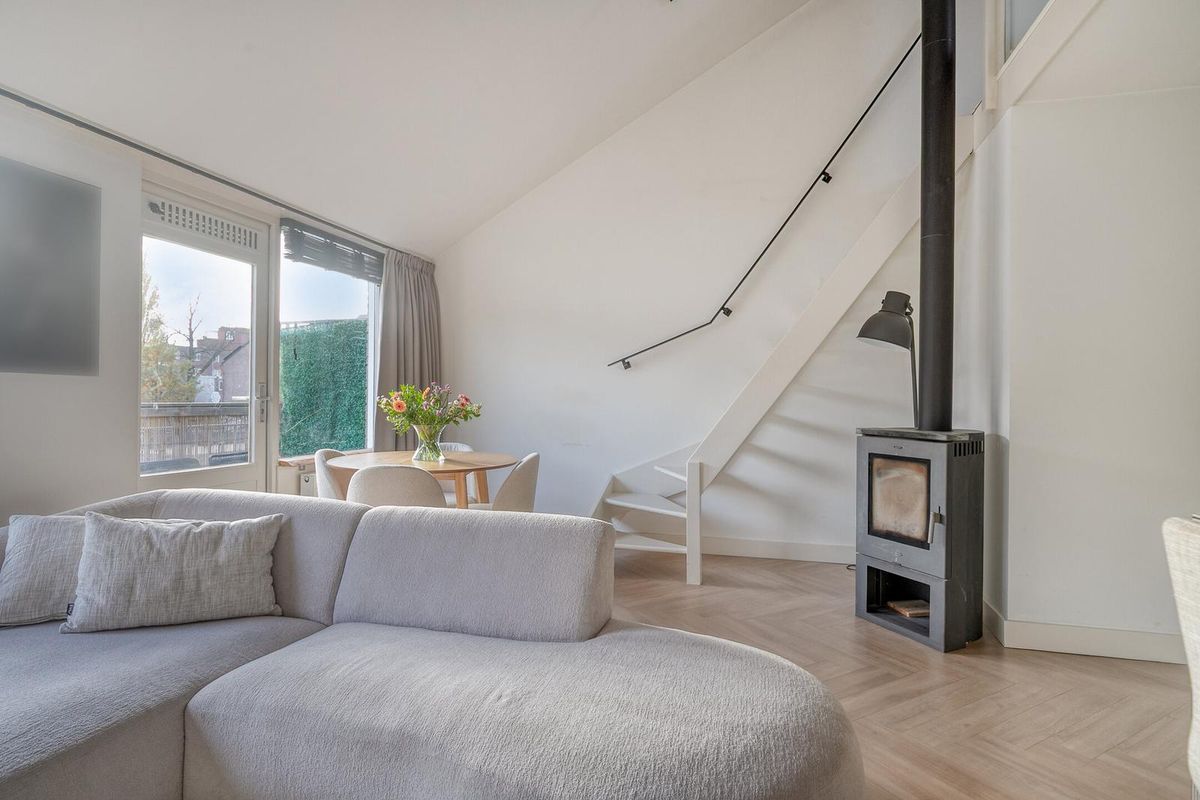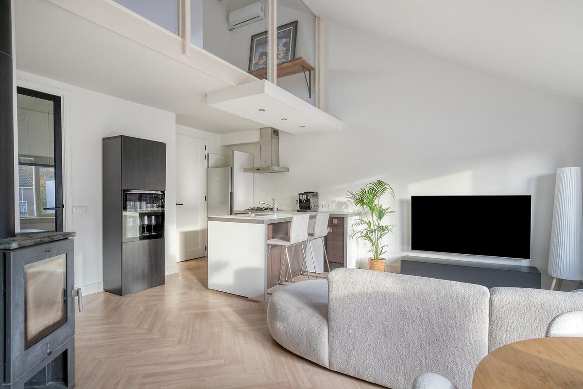 Via een glazendeur stap je de lichte woonkamer met open keuken binnen — het hart van de woning. De grote ramen en de deur naar het zuidelijk gelegen balkon zorgen voor een prettige lichtinval. De strak afgewerkte wanden en de lichte visgraat laminaatvloer geven het geheel een moderne uitstraling. Er is voldoende ruimte voor een gezellige zithoek als een eethoek. En op koude dagen zorgt de houtkachel voor extra sfeer en warmte.