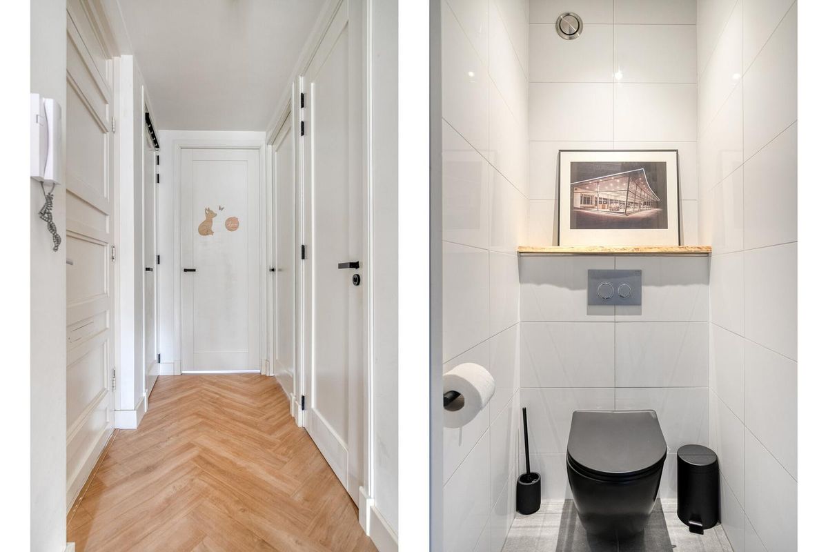 Bij binnenkomst in de hal van het appartement heb je toegang tot de badkamer, toilet, meterkast, twee ruime slaapkamers en uiteraard de woonkamer. De badkamer is uitgevoerd in een moderne zwart-witte kleurstelling en voorzien van een wastafelmeubel, radiator en comfortabele inloopdouche.