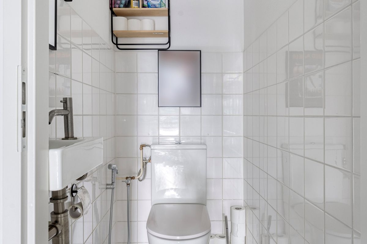 De badkamer beschikt over een douche, wastafel met meubel, extra kastruimte en een wasmachine. Daarnaast is er een apart toilet met fonteintje.