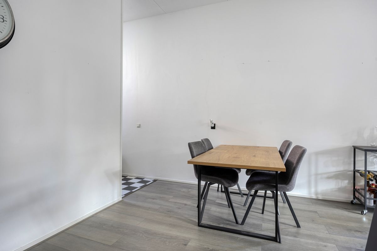 De ruime woonkamer heeft veel lichtinval en grenst aan de halfopen keuken, voorzien van moderne apparatuur zoals koelkast, vriezer, gaskookplaat, afzuigkap en vaatwasser.