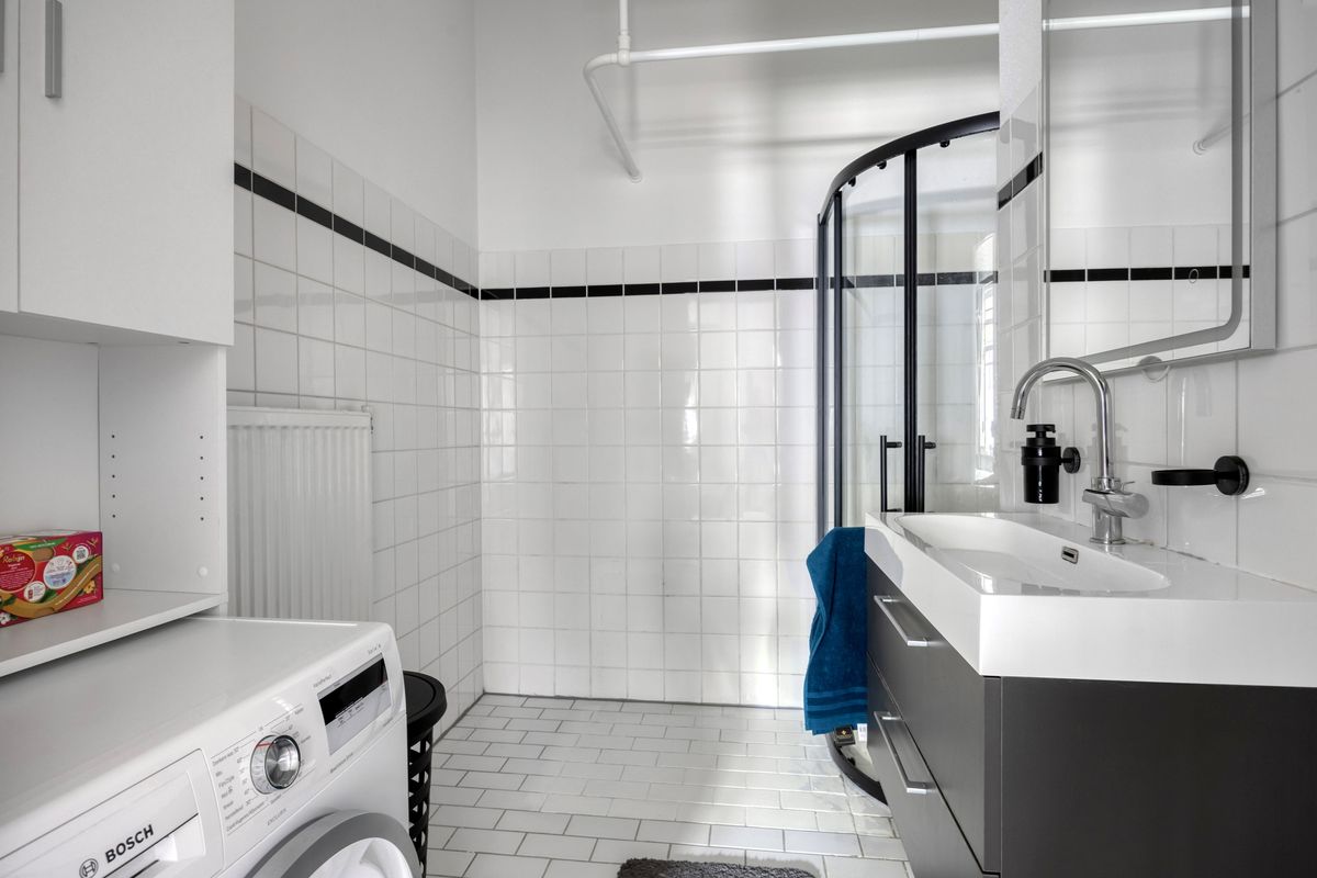 The bathroom features a shower, sink with cabinet, additional storage space and a washing machine. There is also a separate toilet with a small sink.