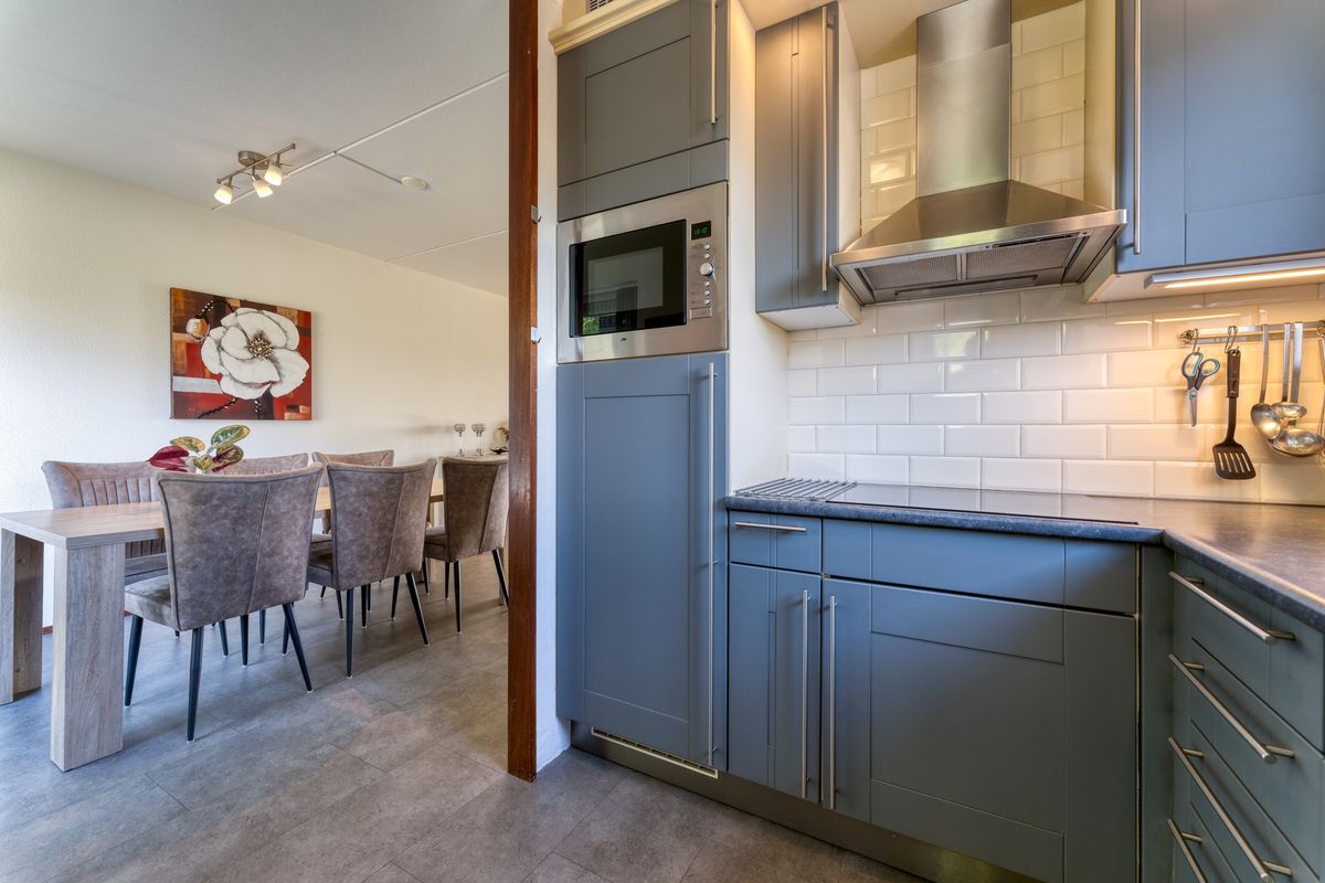 De open keuken sluit hier naadloos op aan en is volledig ingericht met moderne apparatuur, waaronder een inductiekookplaat, combimagnetron, afwasmachine en een koelkast met vriesvak. Dankzij de open opzet blijft u altijd in contact met uw gezelschap tijdens het koken.