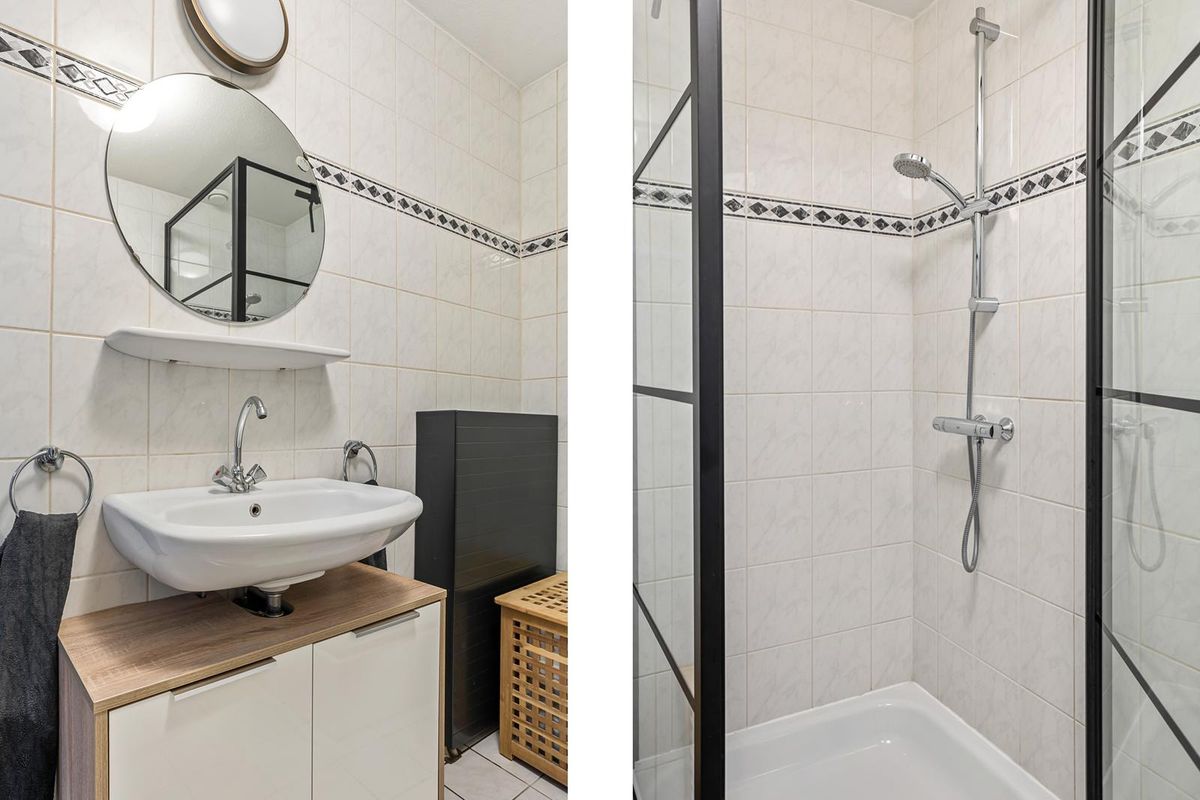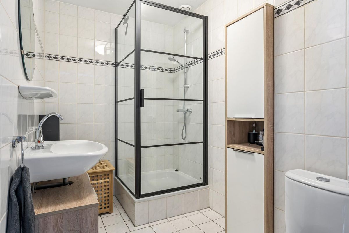 De badkamer is volledig betegeld en voorzien van een douchecabine met handdouche, wastafelmeubel, badkamerkast en een tweede toilet.