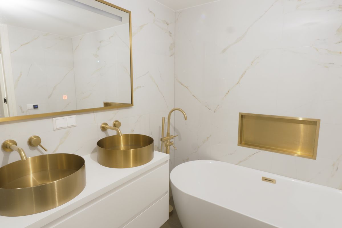 - Badkamer met inloopdouche, ligbad en dubbele wastafel