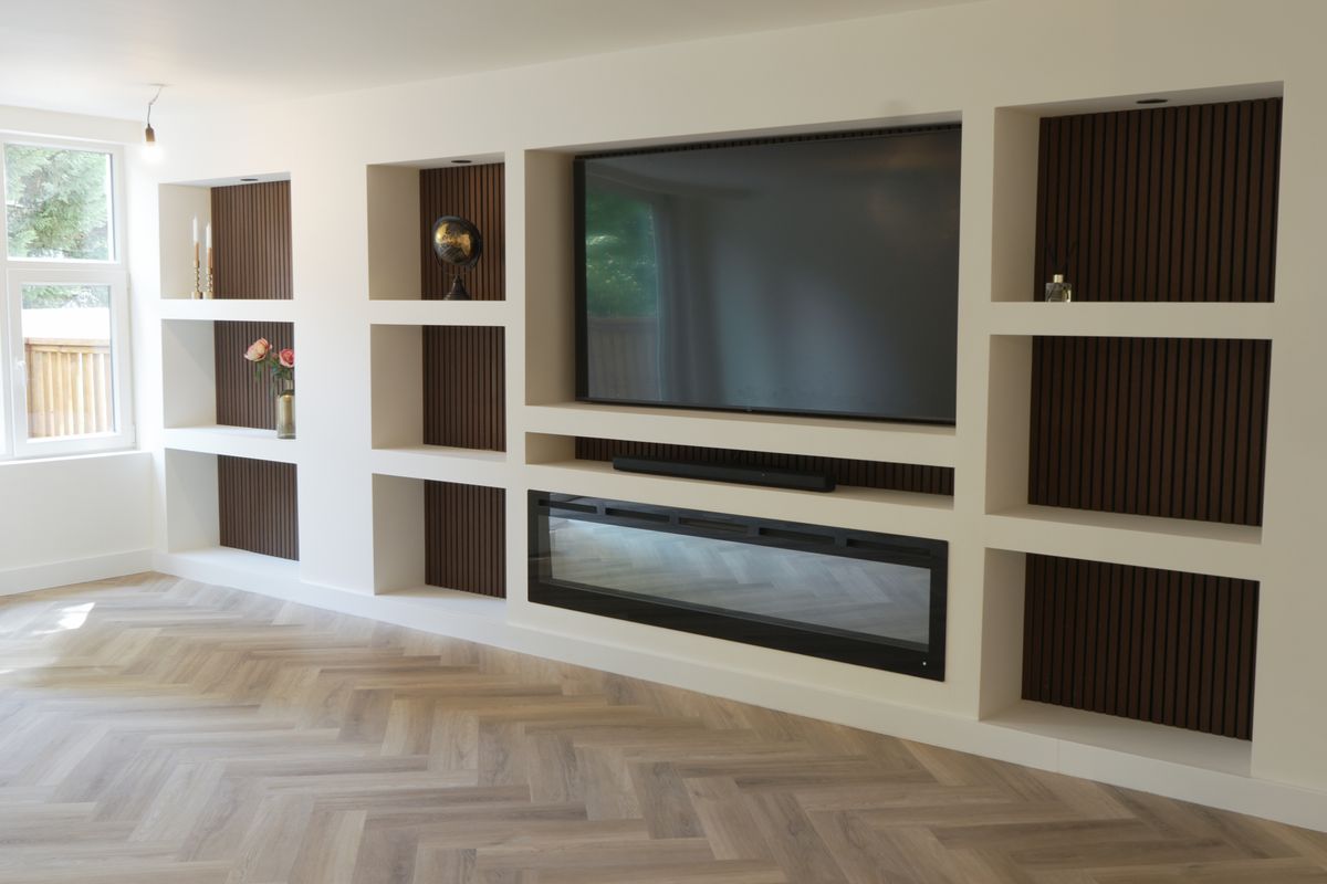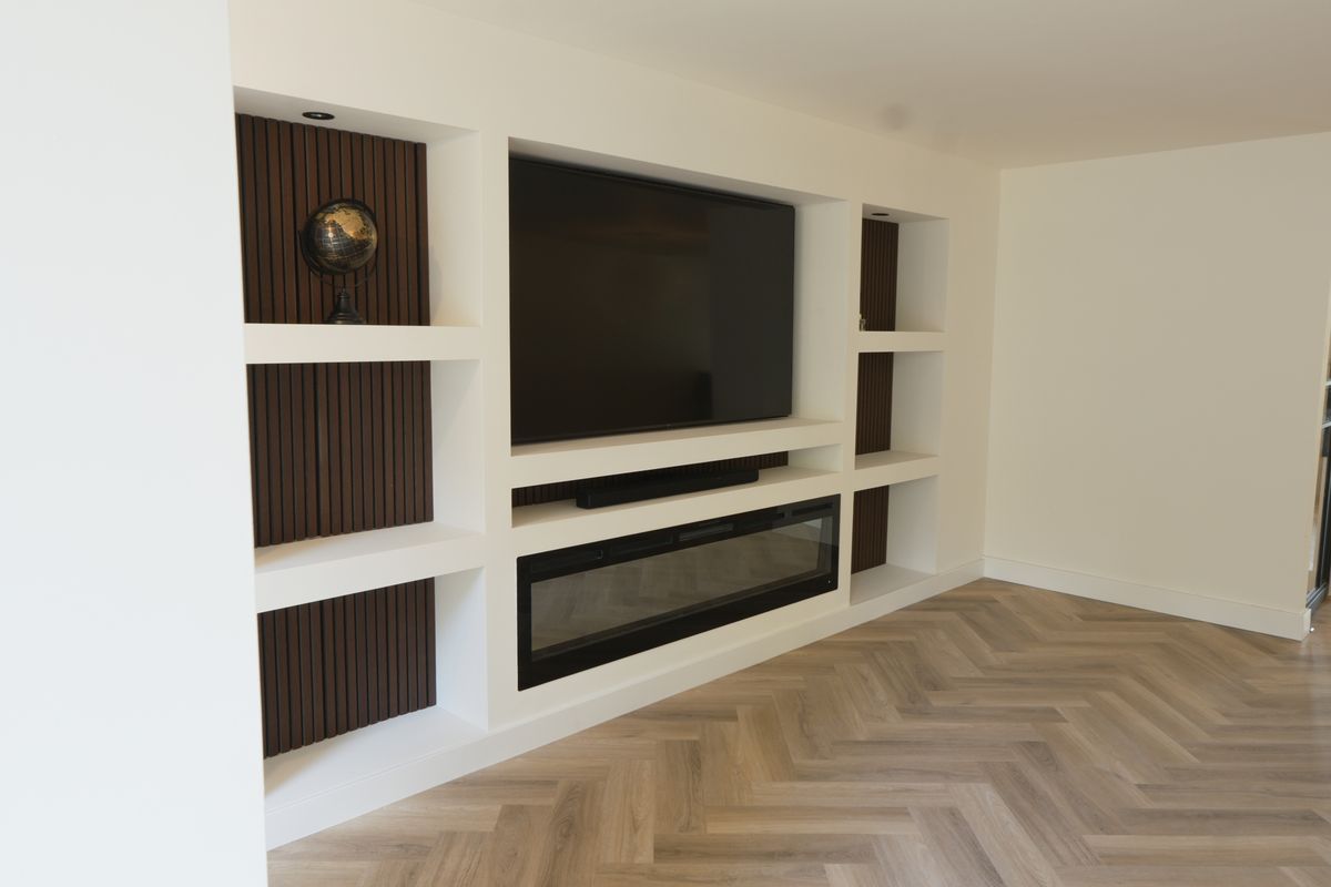 Aan de achterzijde van het woongedeelte de mooie schuifpui en een prachtige inbouw wandkastcombinatie. Hier heb je een heerlijk breed zonneterras op het zuidoosten met toegang tot de achtertuin.