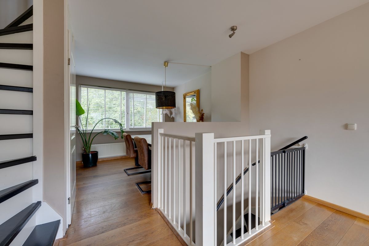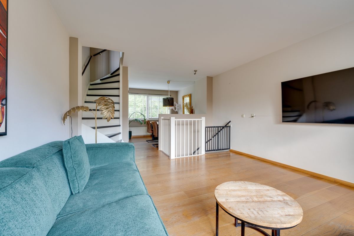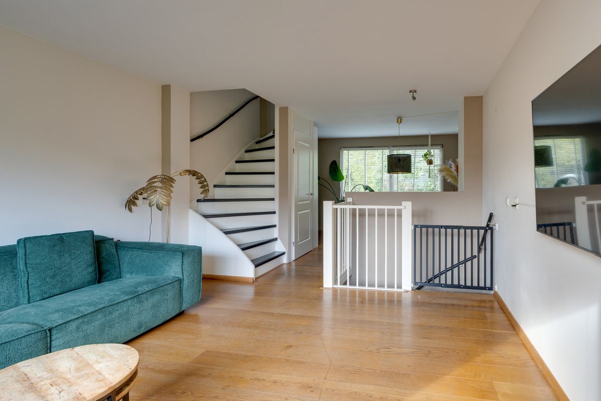 Via de vaste trap in de keuken kom je op de eerste verdieping, waar je direct binnenstapt in de bijzonder ruime woonkamer. Doordat hier binnenmuren zijn verwijderd en dankzij de grote raampartijen aan zowel de voor- als achterzijde, geniet je van een overvloed aan daglicht.