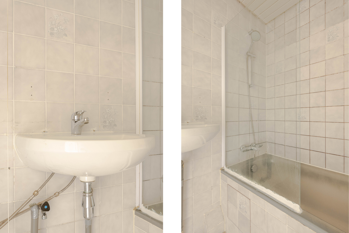 * Te moderniseren badkamer, geheel betegeld, voorzien van mechanische ventilatie, ligbad met de douche en wastafel.